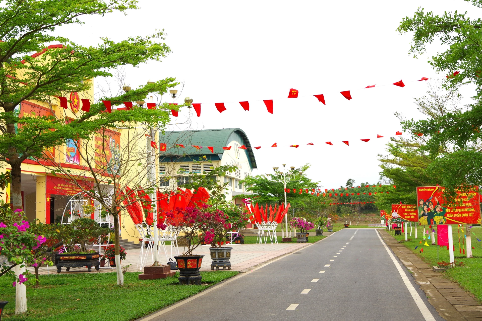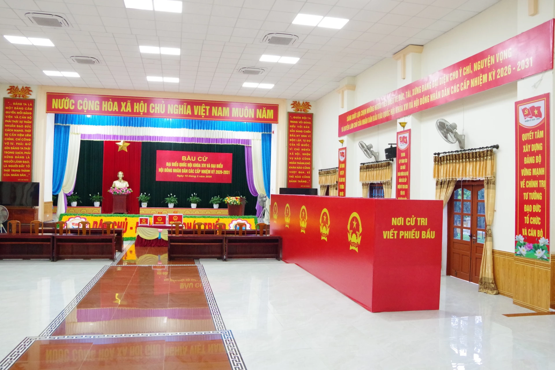 Hệ thống pa-nô, khẩu hiệu, cờ hoa tại khu vực bỏ phiếu được trang trí trang trọng.