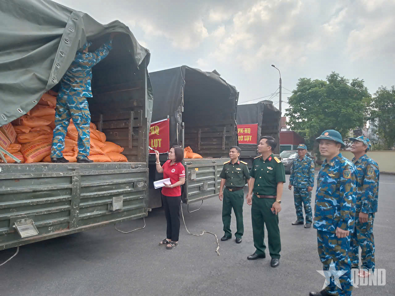 Cán bộ, chiến sĩ Sư đoàn Không quân 372 và Bộ CHQS, Hội Chữ thập đỏ tỉnh Thái Nguyên tiến hành bàn giao các nhu yếu phẩm hỗ trợ nhân dân.