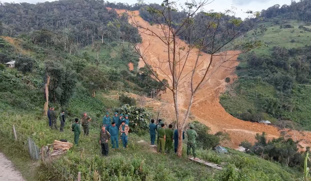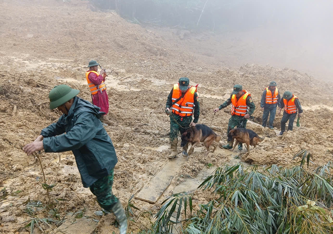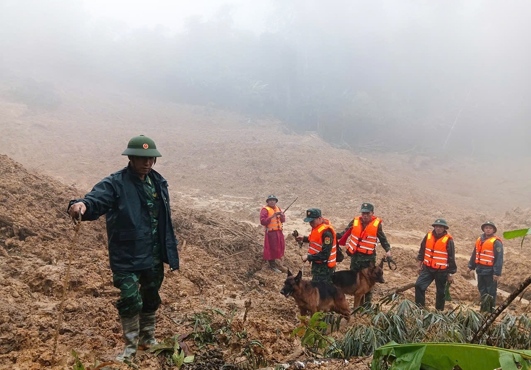 Hơn 150 cán bộ, chiến sĩ cùng nhiều phương tiện cơ giới đang có mặt tại hiện trường. Lực lượng tìm kiểm sử dụng thiết bị bay không người lái để trinh sát từ trên cao, dùng chó nghiệp vụ rà phía dưới. Lực lượng làm nhiệm vụ tại chỗ tiếp tục cắm mốc, phong tỏa, cấm tuyệt đối người dân vào khu vực sạt lở, đồng thời tổ chức trinh sát các điểm nứt mới có nguy cơ tiếp tục sụt trượt.