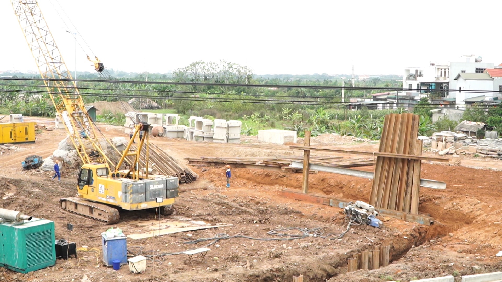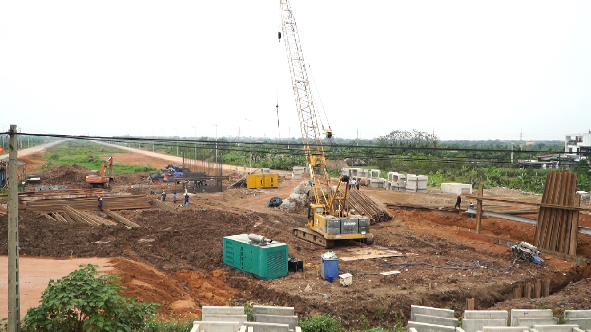 Không khí thi công khẩn trương tại công trường Dự án đường Vành đai 4 - Vùng Thủ đô, đoạn qua địa bàn xã Ô Diên. Ảnh: Hương Ly