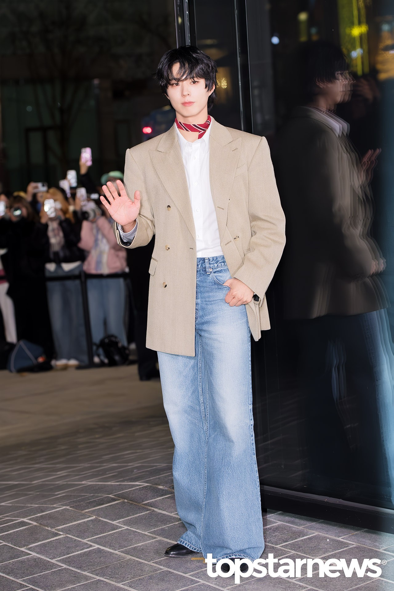 Tại sự kiện mới nhất của nhà mốt CELINE, mỹ nam sinh năm 1993 nổi bật trong trang phục mang hơi thở retro. Chiếc khăn lụa đỏ kẻ sọc buộc cổ trở thành điểm nhấn đắt giá, tôn lên visual "tuyệt đối điện ảnh" của nam đại sứ.