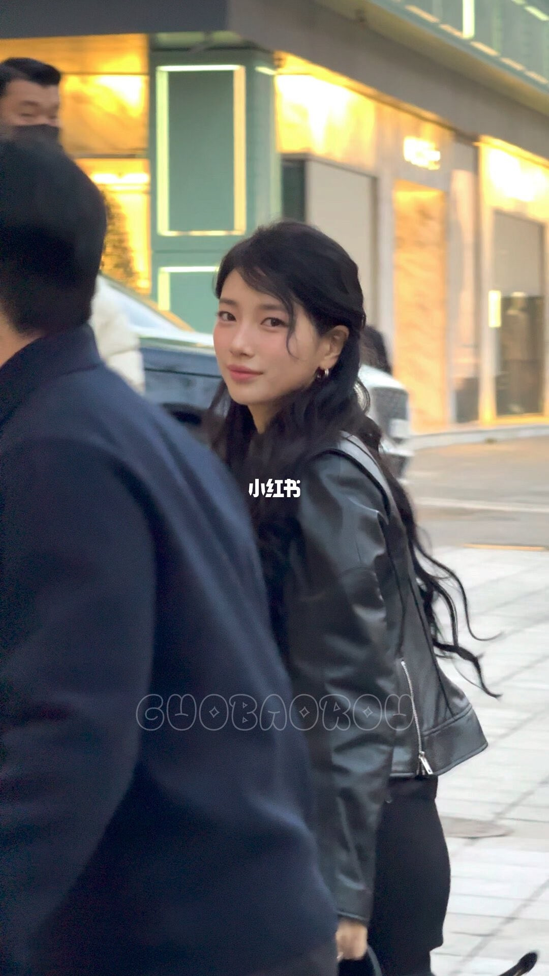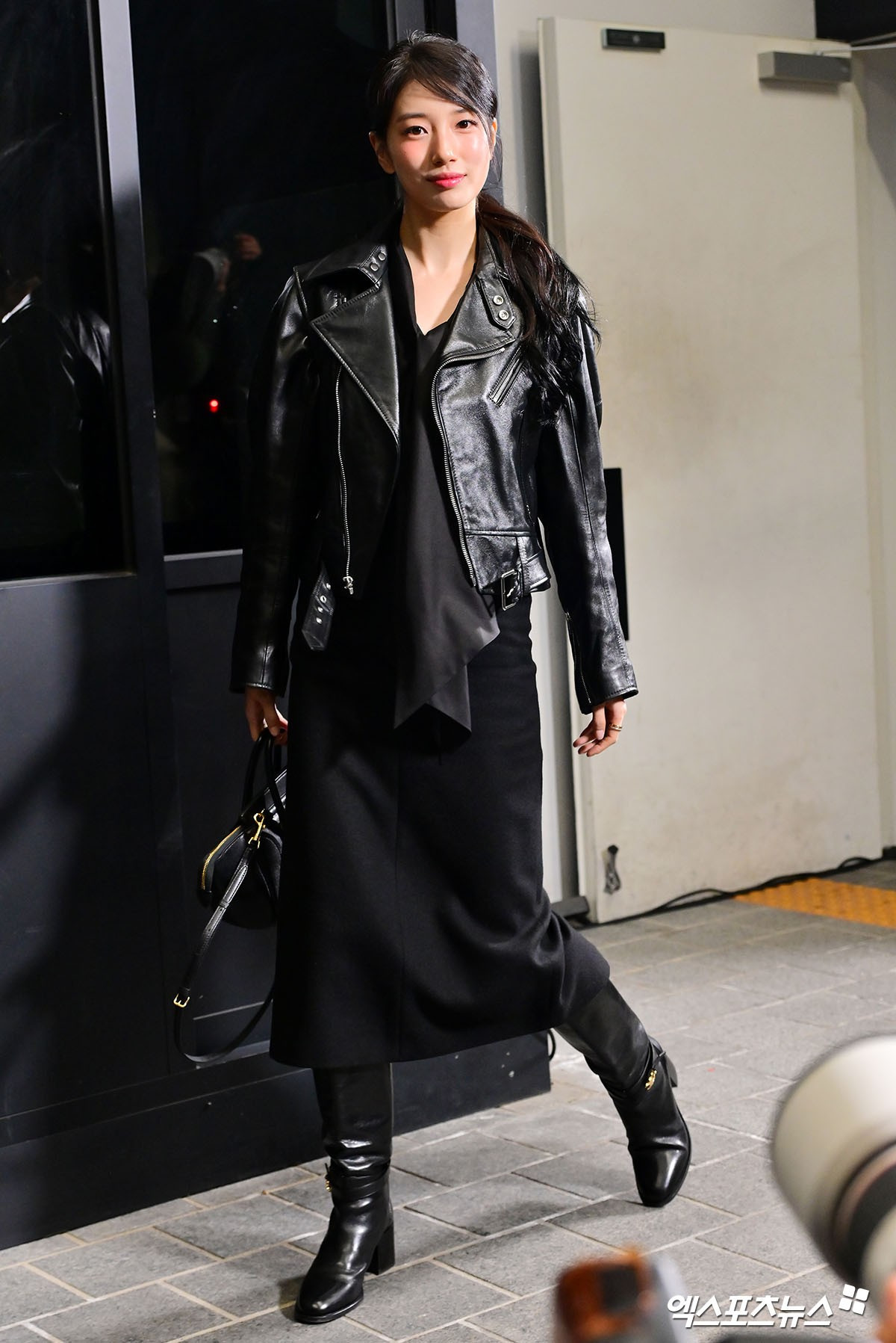 Chọn gam đen chủ đạo, Suzy phối đầm ôm dài cùng áo da phom ngắn. Cô hoàn thiện tạo hình với bốt da cao cổ, lăng xê mẫu túi Celine New Luggage cỡ nhỏ giá hơn 120 triệu. Trong các hoạt động tại Year End Party, nàng thơ xứ Hàn liên tục biến hóa với nhiều kiểu tóc từ mái lệch buộc lơi tới xoăn sóng.