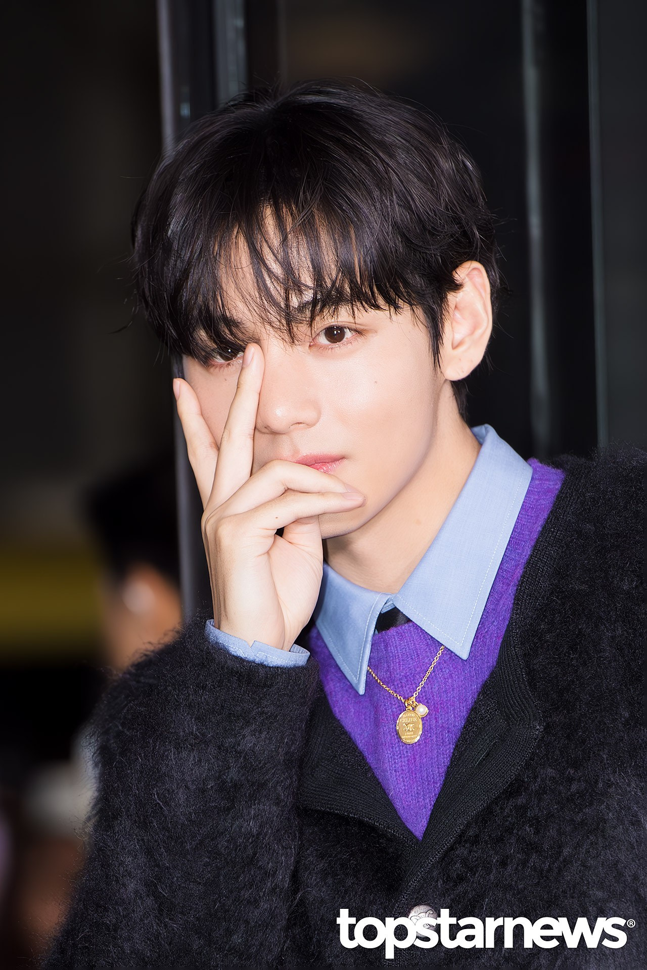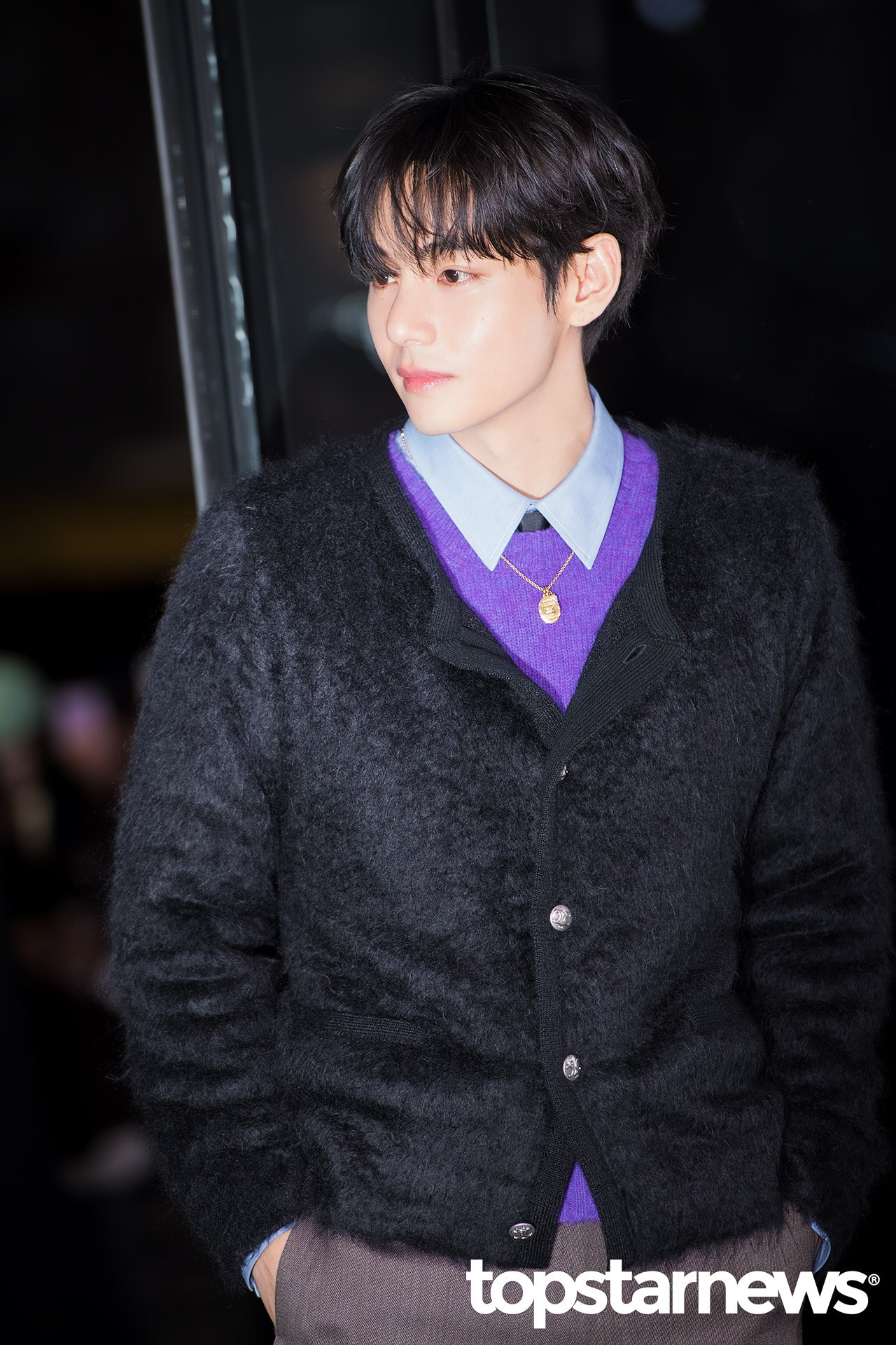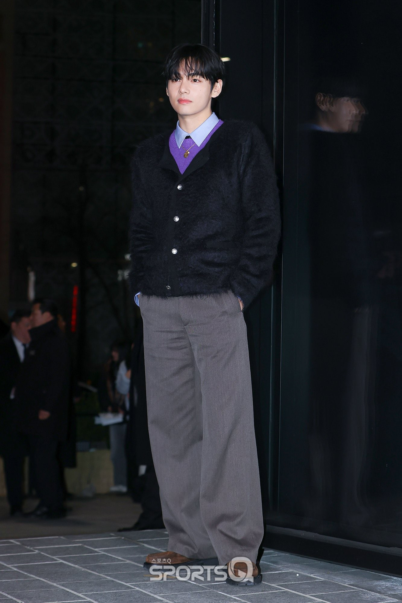 thu hút mọi ống kính truyền thông ngay khi xuất hiện. Nam đại sứ ghi điểm với bản phối ấm áp, thời thượng gồm áo len tím oải hương bên ngoài sơ mi xanh nhạt, khoác cardigan lông xù màu đen. Quần âu ống rộng màu nâu cùng giày da lộn giúp mỹ nam hoàn thiện tạo hình thời thượng, tinh tế.