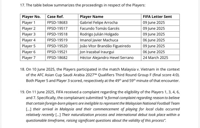 Cụ thể, bên khiếu nại đã gửi “một đơn khiếu nại chính thức về việc có lý do để tin rằng một số cầu thủ sinh ra ở nước ngoài không đủ điều kiện đại diện cho đội tuyển quốc gia Malaysia. Họ mới đến Malaysia và bắt đầu thi đấu cho các câu lạc bộ trong nước gần đây. Quá trình nhập tịch và ra mắt quốc tế của họ diễn ra trong một khoảng thời gian đáng ngờ, làm dấy lên nhiều nghi vấn về tính hợp pháp của quy trình này”.