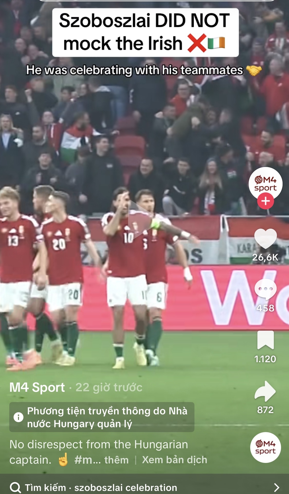 Trên TikTok, hàng loạt những video dùng hình ảnh trên để điều hướng dư luận, tỏ ra hả hê khi người chế nhạo đối thủ lại nhận kết đắng sau đó. Ở những giây cuối cùng, Hungary nhận bàn thua thứ ba từ Ireland. Szoboszlai ngồi thẫn thờ trên mặt cỏ, không giấu nổi sự thất vọng và bàng hoàng.