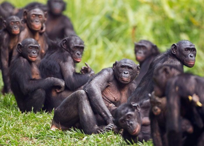 Xã hội bonobo do con cái thống trị. Khác với tinh tinh thường, nơi con đực thống trị, bonobo sống trong nhóm mẫu hệ, nơi các con cái quyết định thứ bậc xã hội. Ảnh: Pinterest.