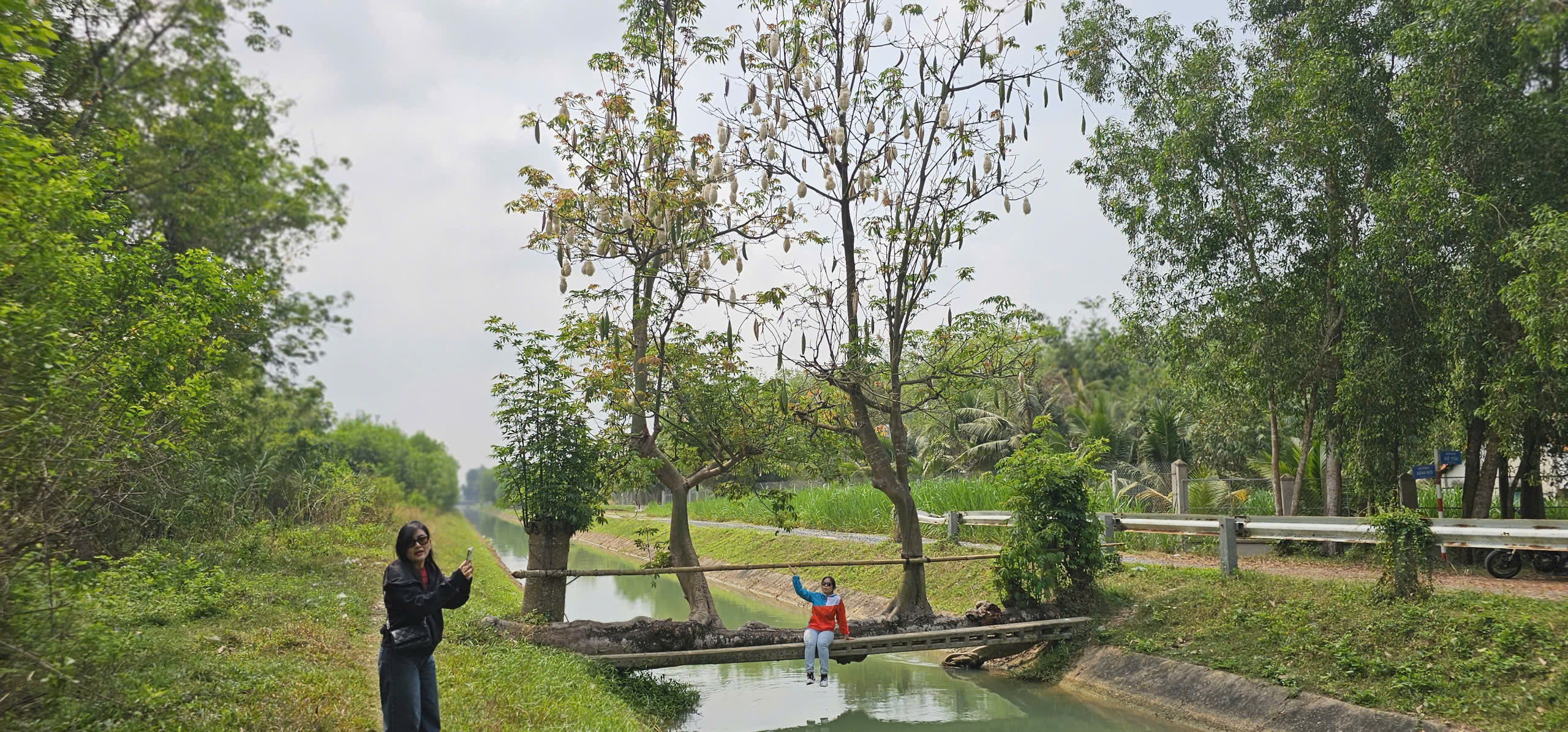 "Thấy cây gòn này rất lạ, hoa nở rộ nhìn rất đẹp. Thân cây to, nằm ngang mặt kênh tạo nên bối cảnh chụp hình rất thư giãn. Dù đường xa và nắng nóng nhưng khi đến nơi, thấy cảnh tượng này tôi cảm thấy rất xứng đáng", chị Cẩm hào hứng nói.