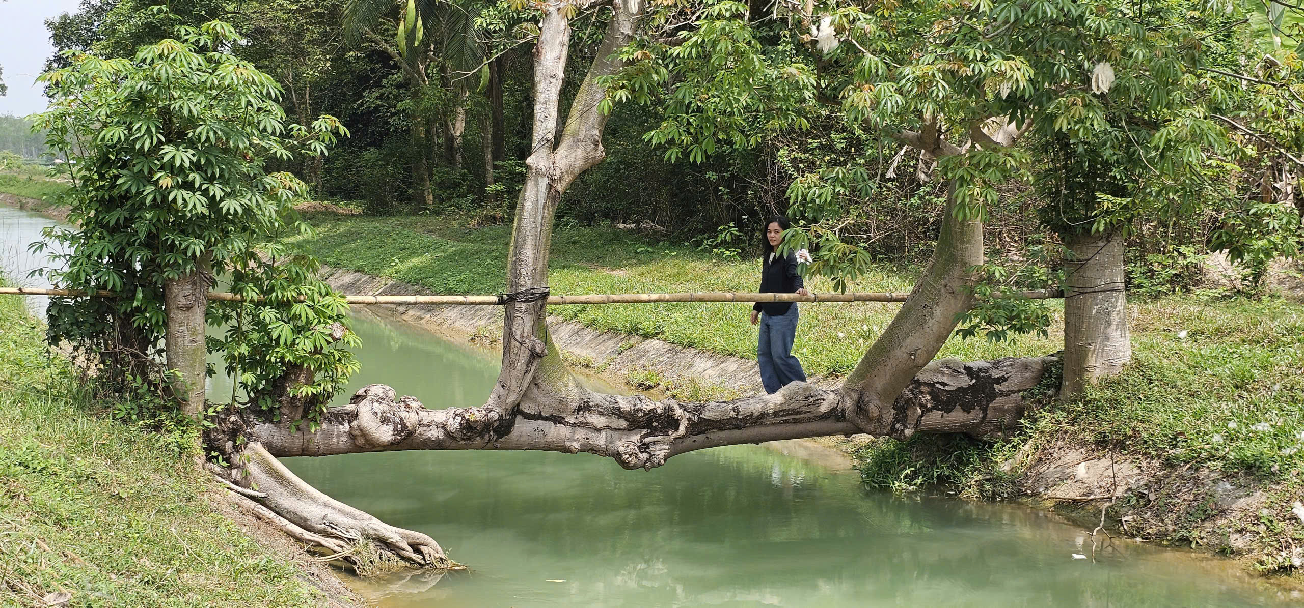 Hình ảnh về "cây cầu sống" này đang lan truyền mạnh mẽ trên mạng xã hội, biến một vùng quê yên bình trở nên nhộn nhịp.