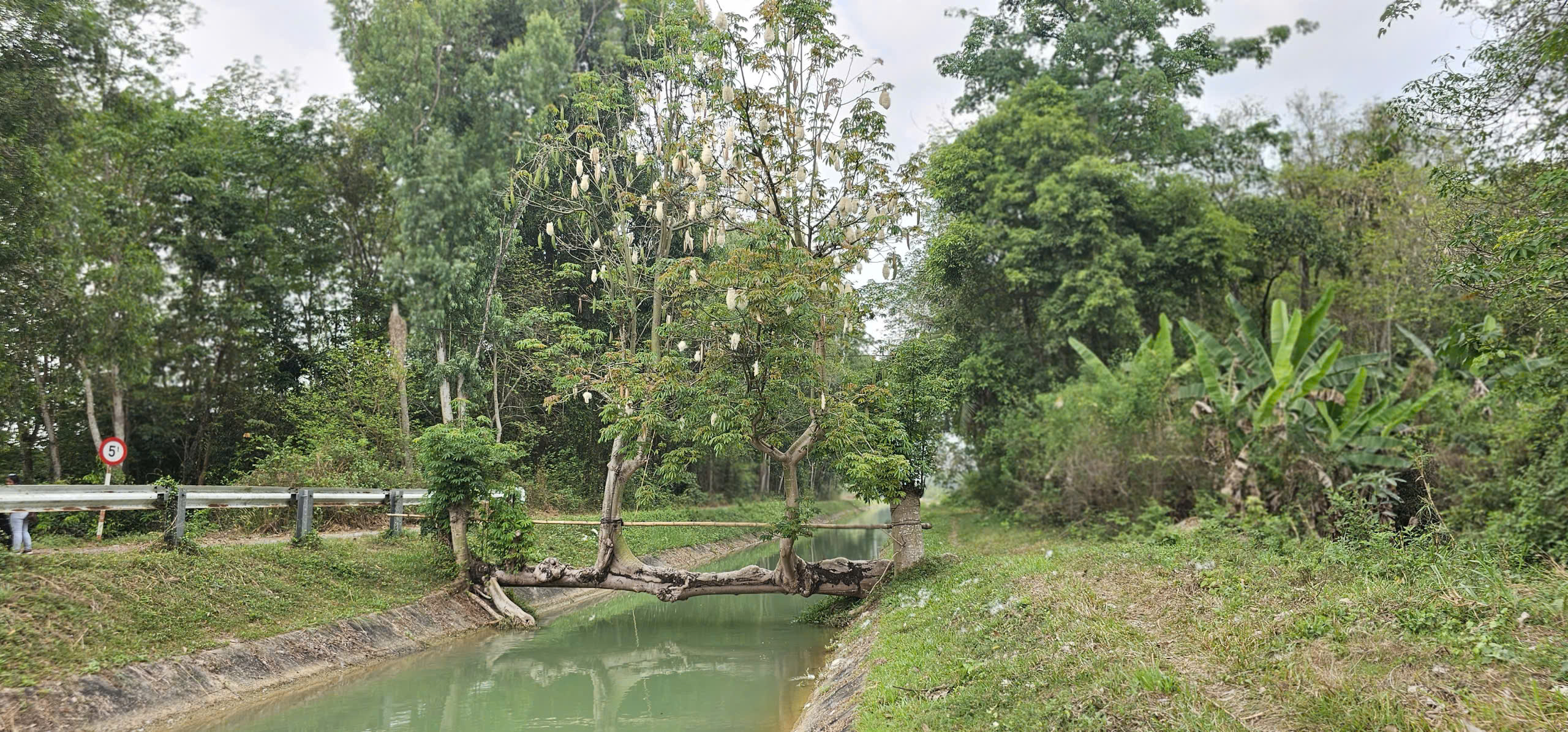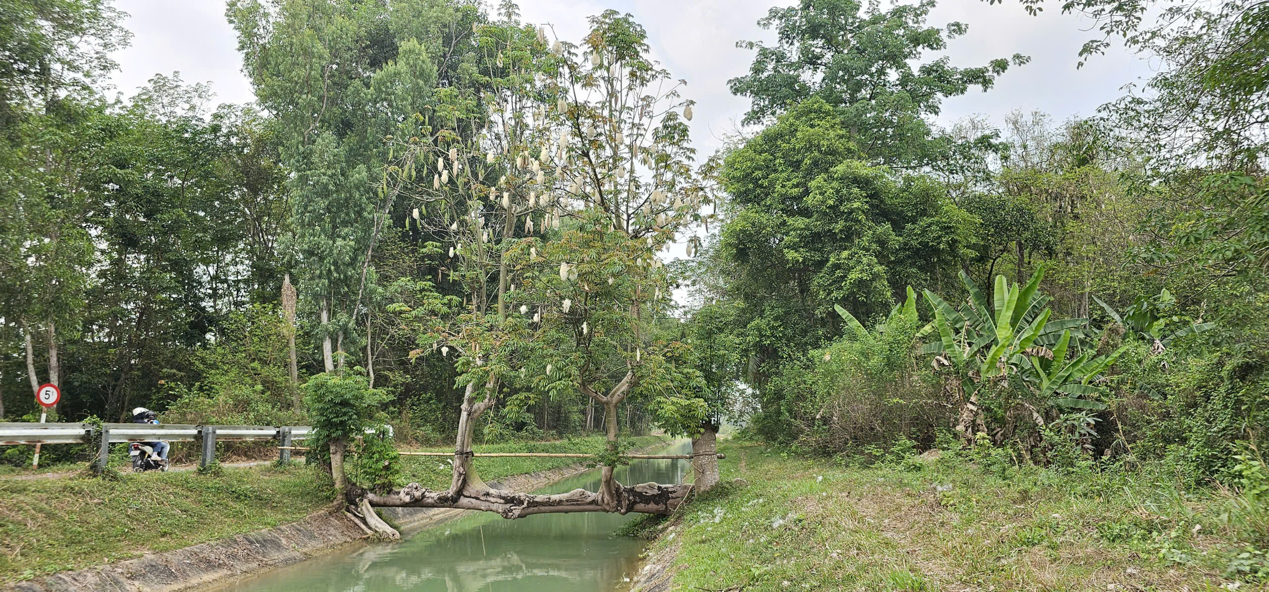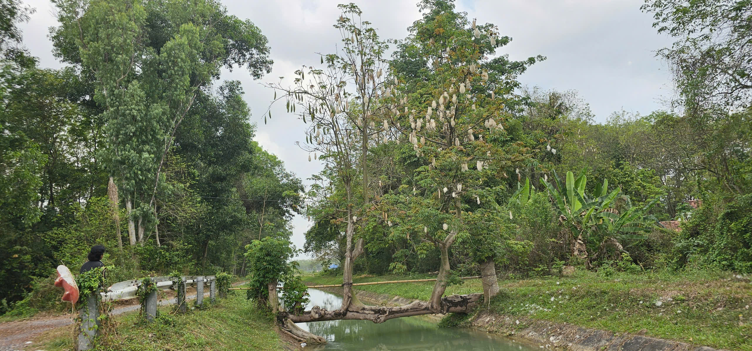 Để đảm bảo an toàn cho việc đi lại và giữ gìn thân cây không bị mục mục gãy theo thời gian, ông Đé còn lắp thêm một cột bê tông kiên cố dọc theo thân cây gòn. Sự kết hợp giữa sức sống thiên nhiên và sự gia cố của con người đã tạo nên một hình ảnh độc nhất vô nhị trên dòng kênh xanh mát.
