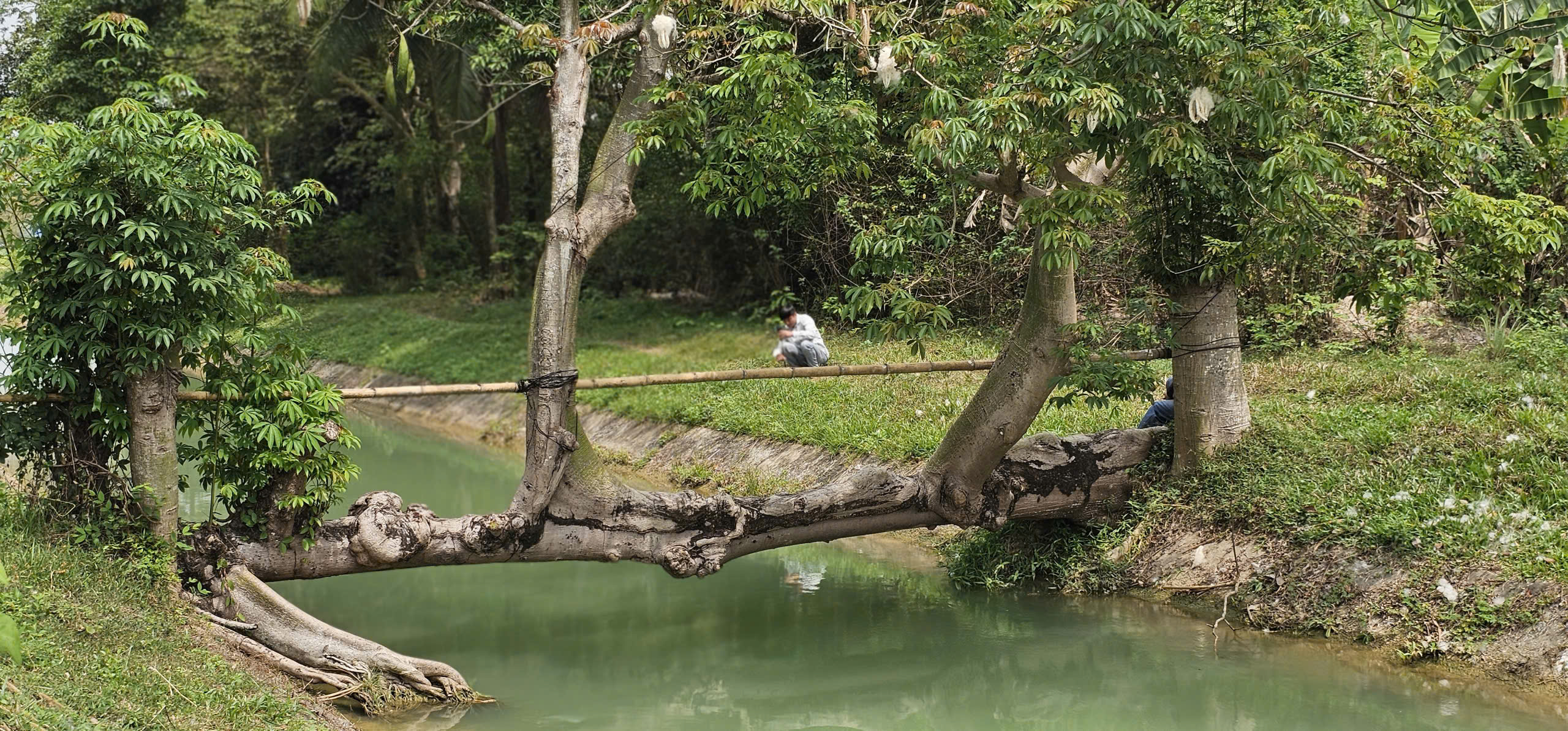 Đến nay, cây gòn đã nằm vắt vẻo qua dòng kênh được khoảng 27 năm. Điểm đặc biệt khiến nhiều người thích thú là các cọc gòn được ông Đé cắm xuống hai bên bờ kênh để cố định thân cây chính trước đây cũng không hề chết đi.
