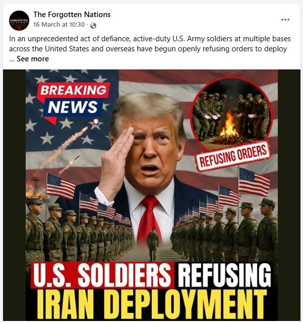 Chuyên trang kiểm chứng thông tin Lead Stories (Mỹ) khẳng định, không có bằng chứng nào cho thấy số lượng lớn binh sĩ Mỹ đang chống lại mệnh lệnh triển khai quân. Những tuyên bố lan truyền trên mạng xã hội là thông tin sai sự thật; và các hashtag #SoldiersRefuse và #NoWarWithIran không hề đứng đầu xu hướng toàn cầu với 18 triệu bài đăng, trái ngược với thông tin lan truyền trên Facebook.