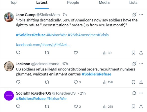 Theo Lead Stories, trong khi hashtag #NoWarWithIran đã được sử dụng rộng rãi kể từ khi bắt đầu cuộc xung đột vì tính chất chung chung của nó, thì #SoldiersRefuse lại không.