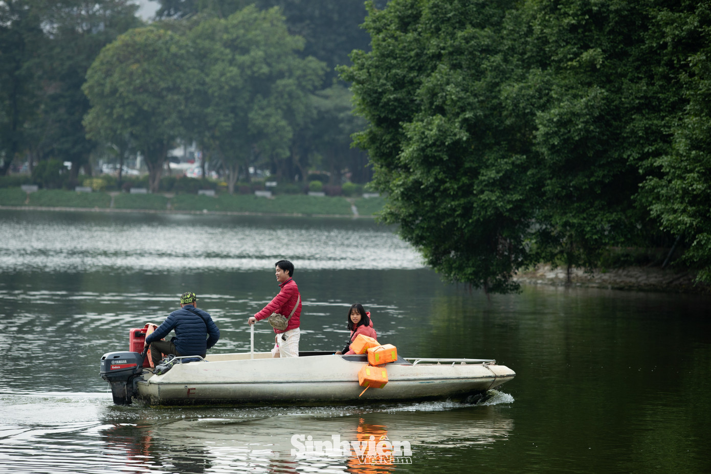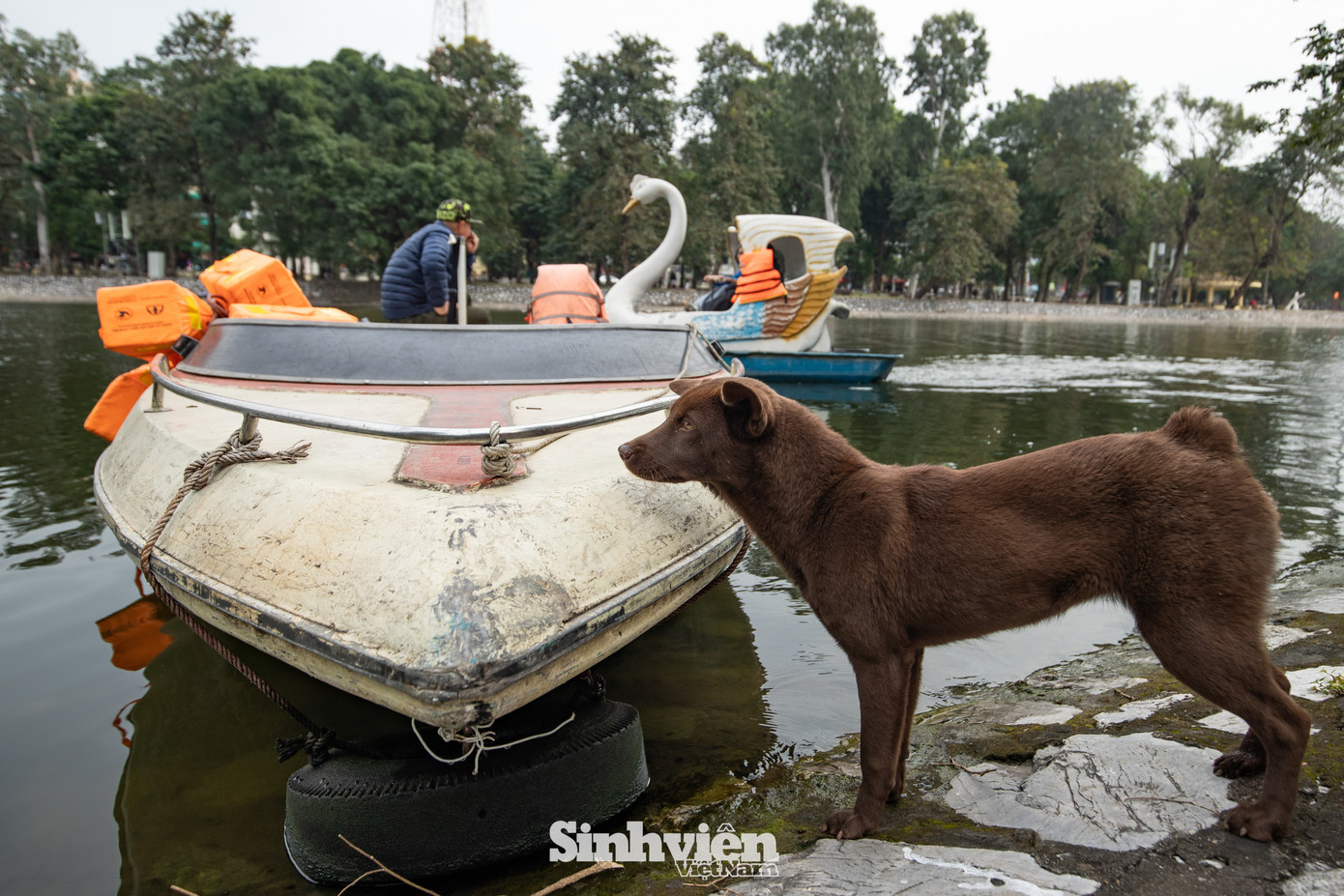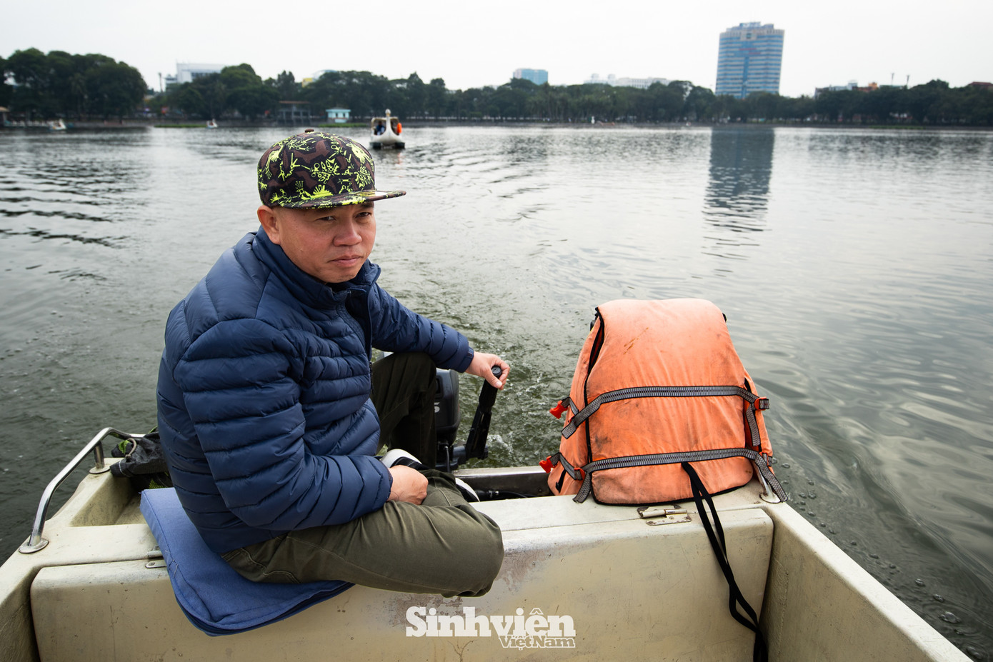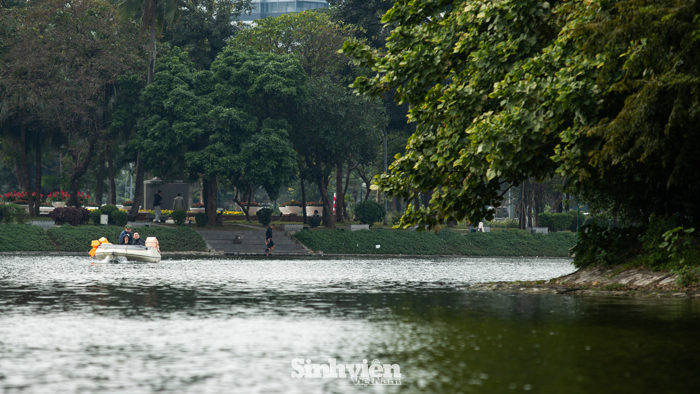 Chú Phong (52 tuổi, Hà Nội) có hơn 30 năm gắn bó với những chiếc thuyền đạp vịt tại công viên Thống Nhất. Chú cũng là người thường lái cano chở khách ra đảo Hòa Bình. "Công việc chính của tôi là làm nhà thuyền, nhưng dạo gần đây bỗng trở nên bận rộn hơn hẳn vì nhiều bạn trẻ có nhu cầu thăm đảo", chú kể. Theo chú Phong, những ngày qua lượng khách ra đảo những ngày qua tăng nhiều, đặc biệt là vào dịp cuối tuần. Có những thời điểm, chú phải chủ động dừng chạy cano đón khách để đảm bảo không gian yên tĩnh trên đảo và cho chó, mèo...nghỉ ngơi.