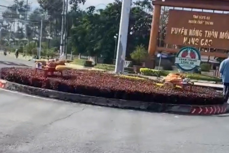 Sau khi trúng vé số đặc biệt, bà X. làm mâm lễ 5 con heo quay cúng giữa vòng xoay Tầm Vu, Tây Ninh gây xôn xao. Ảnh: HC.