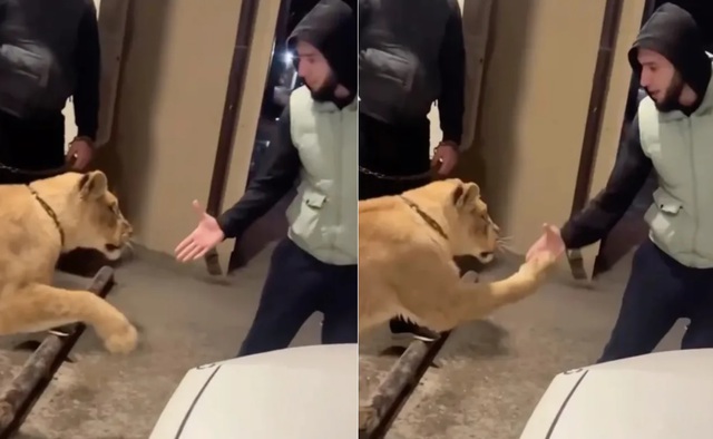 Đoạn clip cho thấy một người đàn ông đang tiến lại gần một con thú bị dắt đi bằng dây xích ở Makhachkala, miền nam nước Nga.