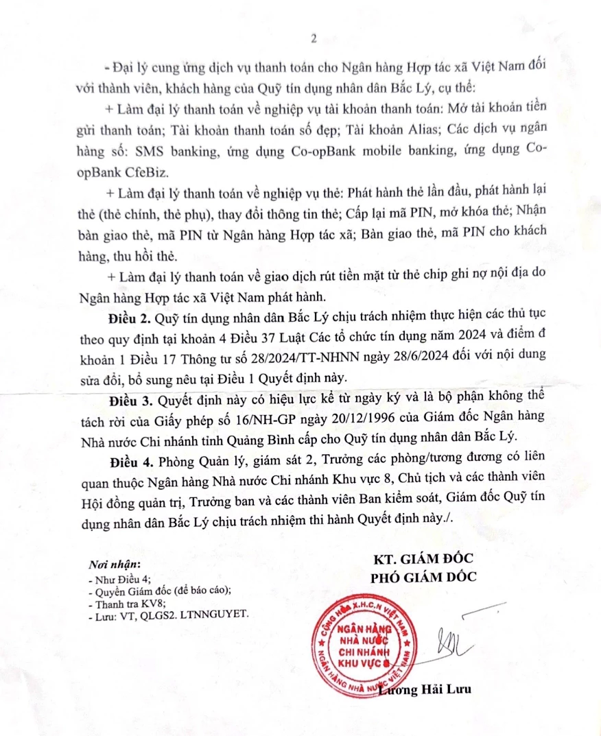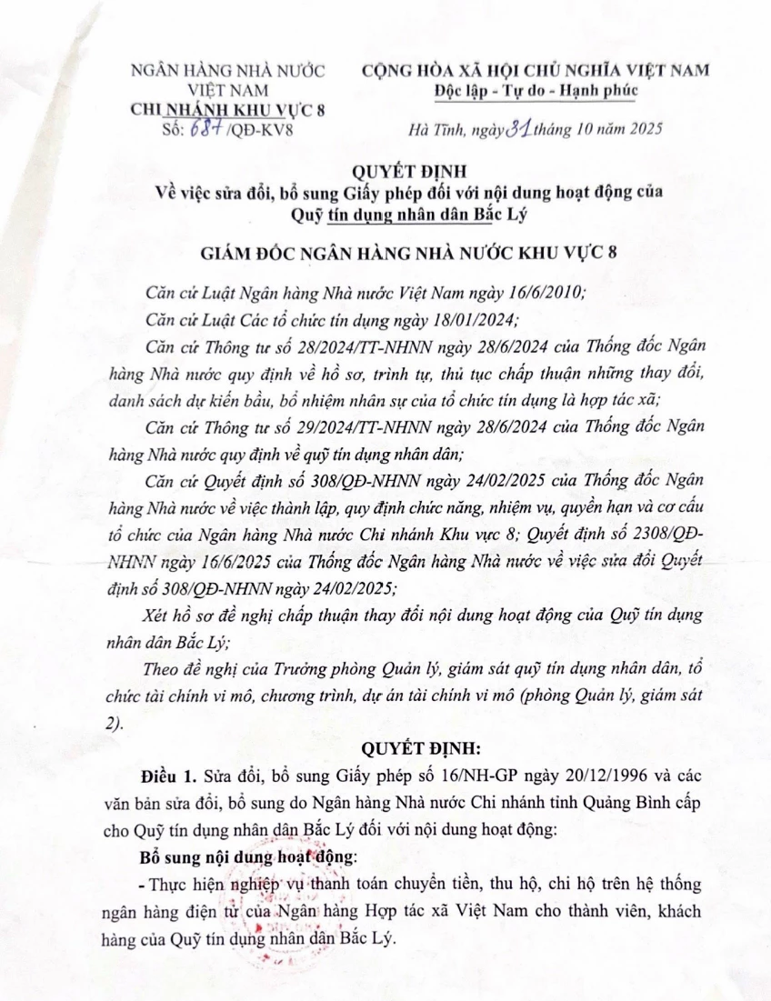 Sửa đổi, bổ sung Giấy phép đối với nội dung hoạt động của Quỹ tín dụng nhân dân Bắc Lý