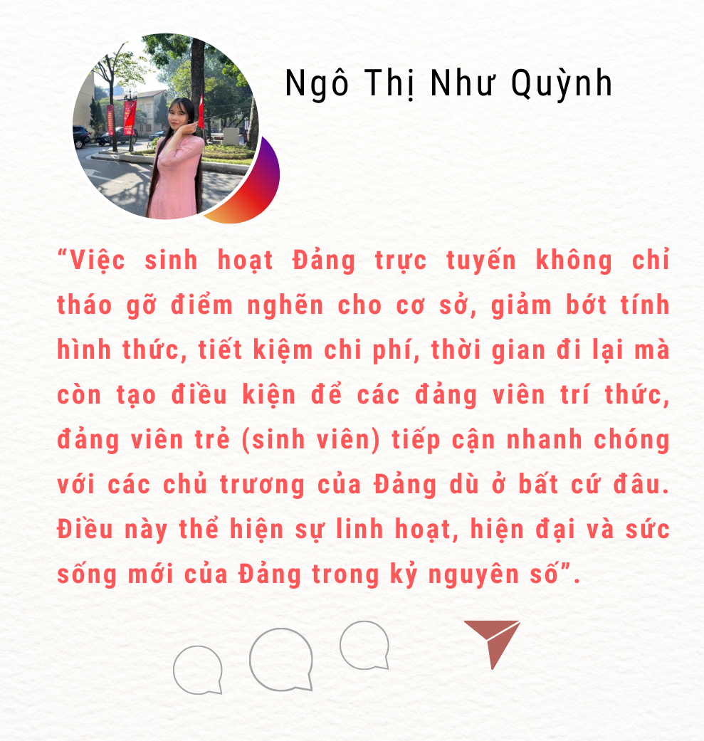 “Việc sinh hoạt Đảng trực tuyến không chỉ tháo gỡ điểm nghẽn cho cơ sở, giảm bớt tính hình thức, tiết kiệm chi phí, thời gian đi lại mà còn tạo điều kiện để các đảng viên trí thức, đảng viên trẻ (sinh viên) tiếp cận nhanh chóng với các chủ trương của Đảng dù ở bất cứ đâu. Điều này thể hiện sự linh hoạt, hiện đại và sức sống mới của Đảng trong kỷ nguyên số”, Như Quỳnh nói.