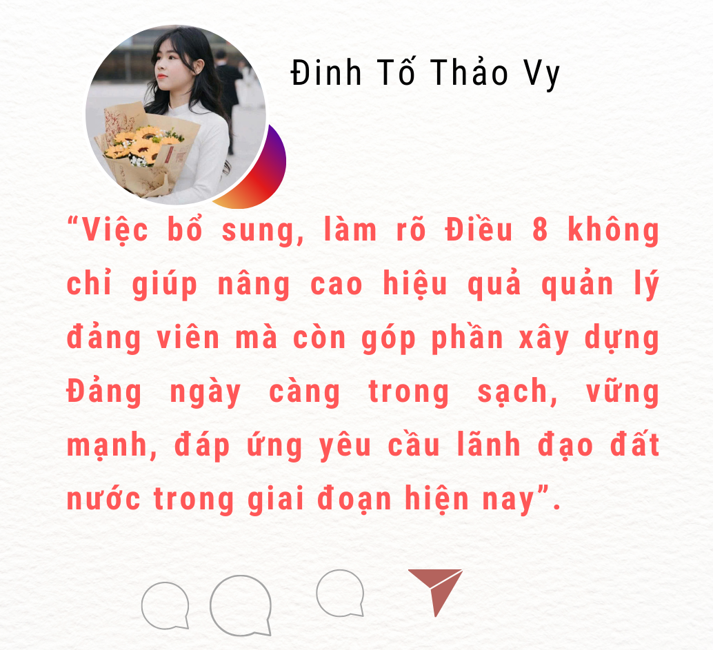 “Việc bổ sung, làm rõ Điều 8 không chỉ giúp nâng cao hiệu quả quản lý đảng viên mà còn góp phần xây dựng Đảng ngày càng trong sạch, vững mạnh, đáp ứng yêu cầu lãnh đạo đất nước trong giai đoạn hiện nay”, Thảo Vy nhìn nhận.