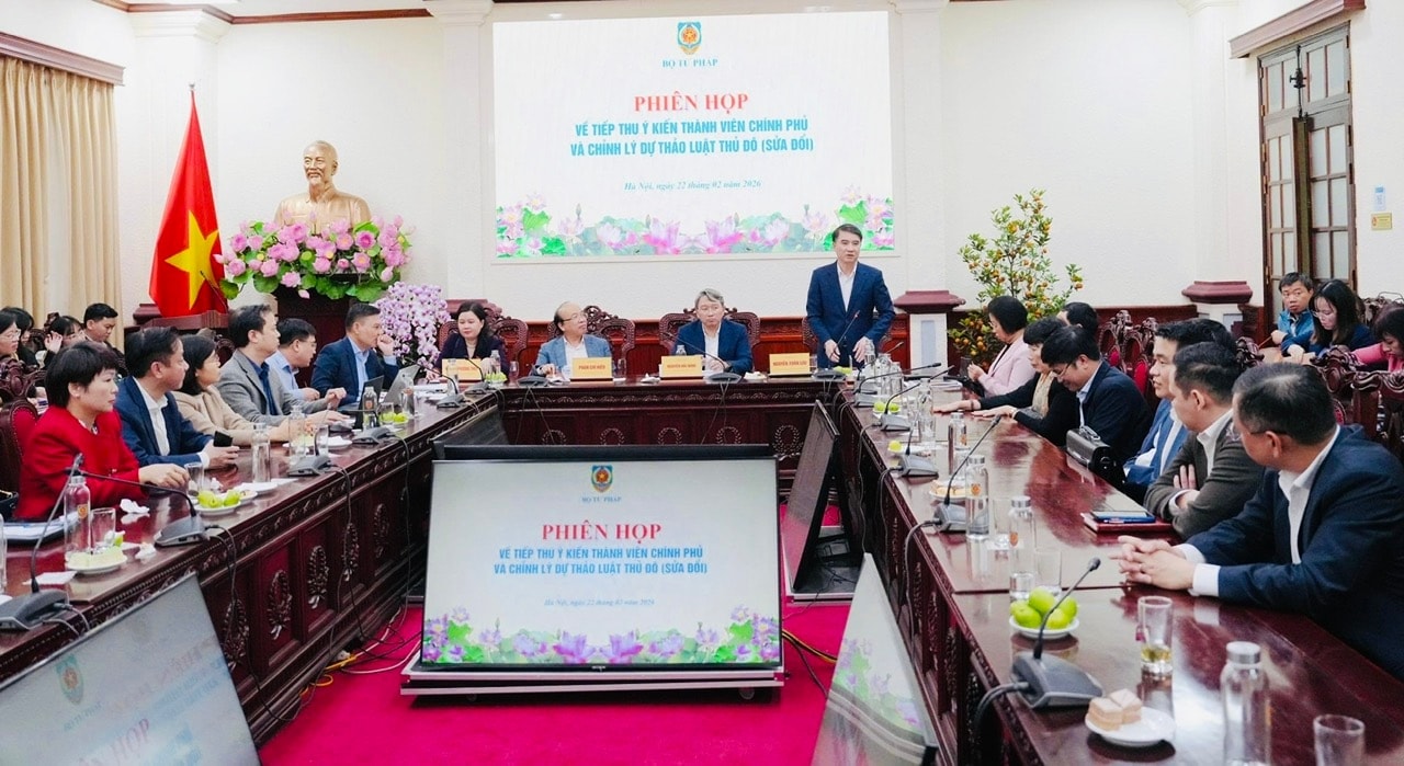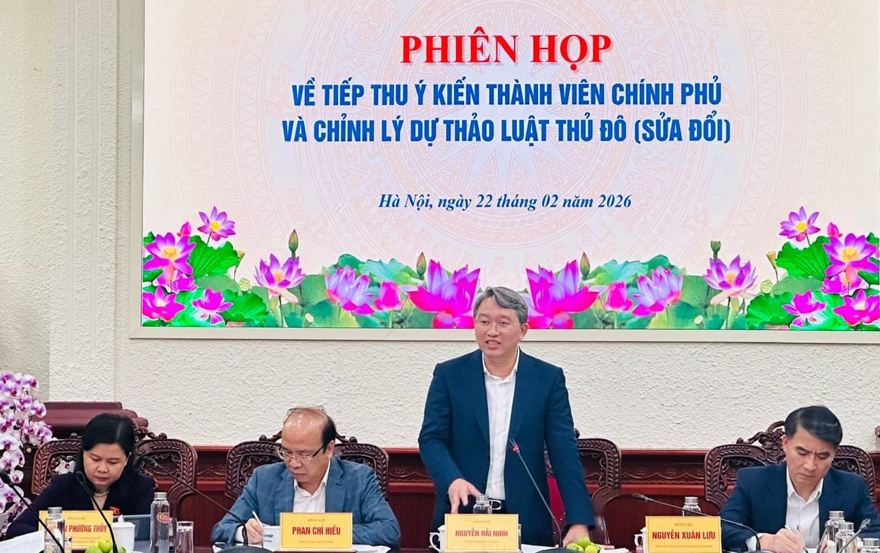 Bộ trưởng Bộ Tư pháp Nguyễn Hải Ninh chủ trì cuộc họp về tiếp thu ý kiến thành viên Chính phủ và chỉnh lý dự thảo Luật Thủ đô (sửa đổi) ngày 22-2. Ảnh: Công Phương