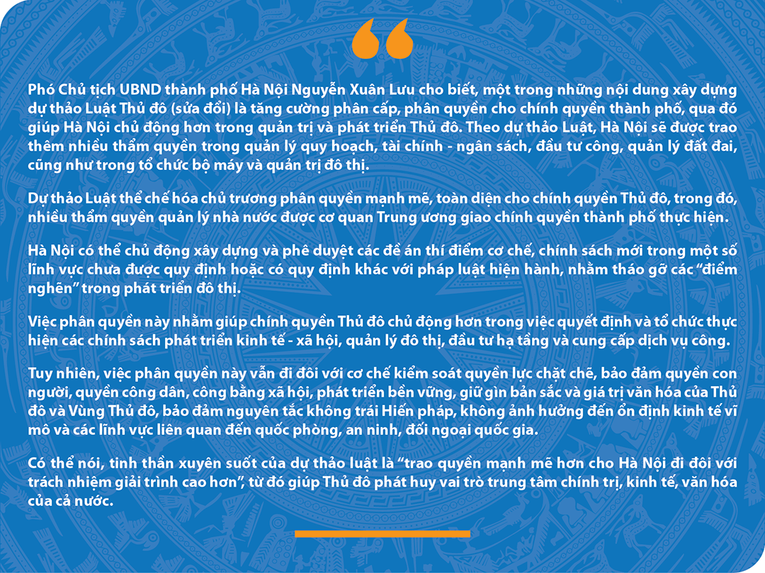 Dự thảo Luật Thủ đô (sửa đổi) đánh dấu bước đột phá về thể chế, tập trung phân cấp, phân quyền triệt để và toàn diện nhằm trao quyền chủ động cho Hà Nội trong phát triển Thủ đô. Tinh thần xuyên suốt trong quá trình xây dựng Luật là “Hà Nội quyết - Hà Nội làm - Hà Nội chịu trách nhiệm”. Dự thảo Luật sẽ được trình Quốc hội xem xét thông qua vào kỳ họp đầu tiên Quốc hội Khóa XVI. Cơ quan Báo và Phát thanh, Truyền hình Hà Nội có loạt bài ghi nhận về quá trình xây dựng Luật Thủ đô (sửa đổi).