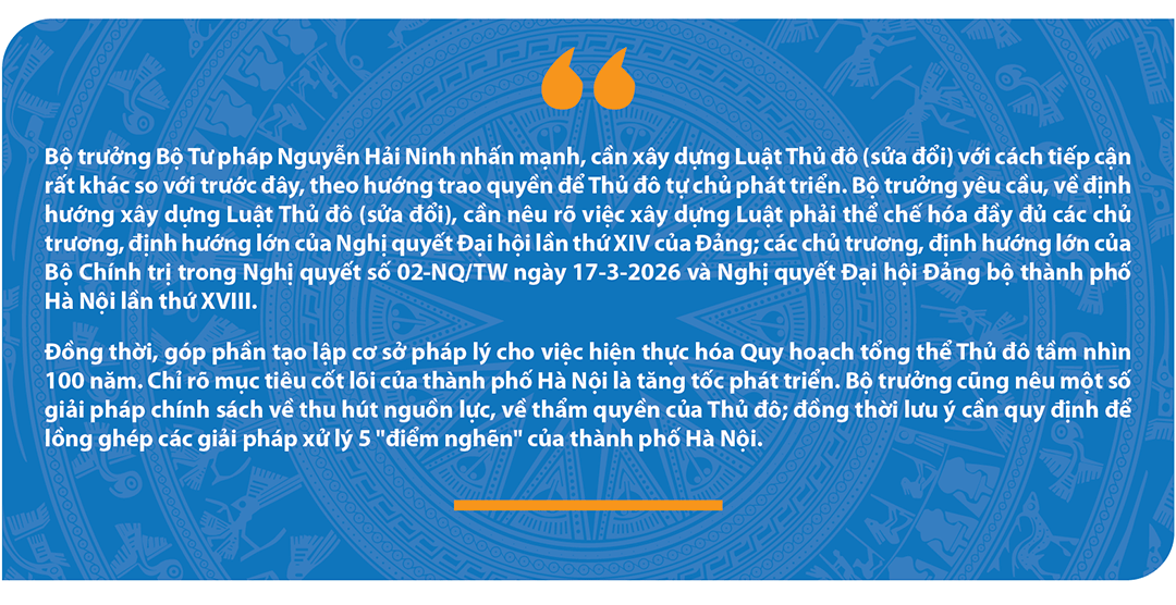 Đặc biệt, thông báo kết luận buổi làm việc của đồng chí Tổng Bí thư Tô Lâm với Ban Thường vụ Thành ủy Hà Nội (Văn bản số 491-TB/VPTW ngày 13-1-2026) chỉ rõ: “Việc hoàn thiện thể chế, sửa đổi Luật Thủ đô lần này phải được tiếp cận với tư duy đổi mới, tầm nhìn dài hạn, tạo cơ sở pháp lý vượt trội, đủ mạnh để Hà Nội phát huy tối đa tiềm năng, lợi thế đặc thù…”. Đồng thời, đồng chí Tổng Bí thư chỉ đạo: “Đảng ủy Chính phủ, Đảng ủy Quốc hội, các ban, bộ, ngành của Trung ương, các địa phương đồng hành, chia sẻ và tạo điều kiện tối đa để Hà Nội có đủ không gian pháp lý, đủ công cụ và đủ thẩm quyền cần thiết nhằm phát huy vai trò Thủ đô là trung tâm dẫn dắt, lan tỏa phát triển Vùng Thủ đô và cả nước”.