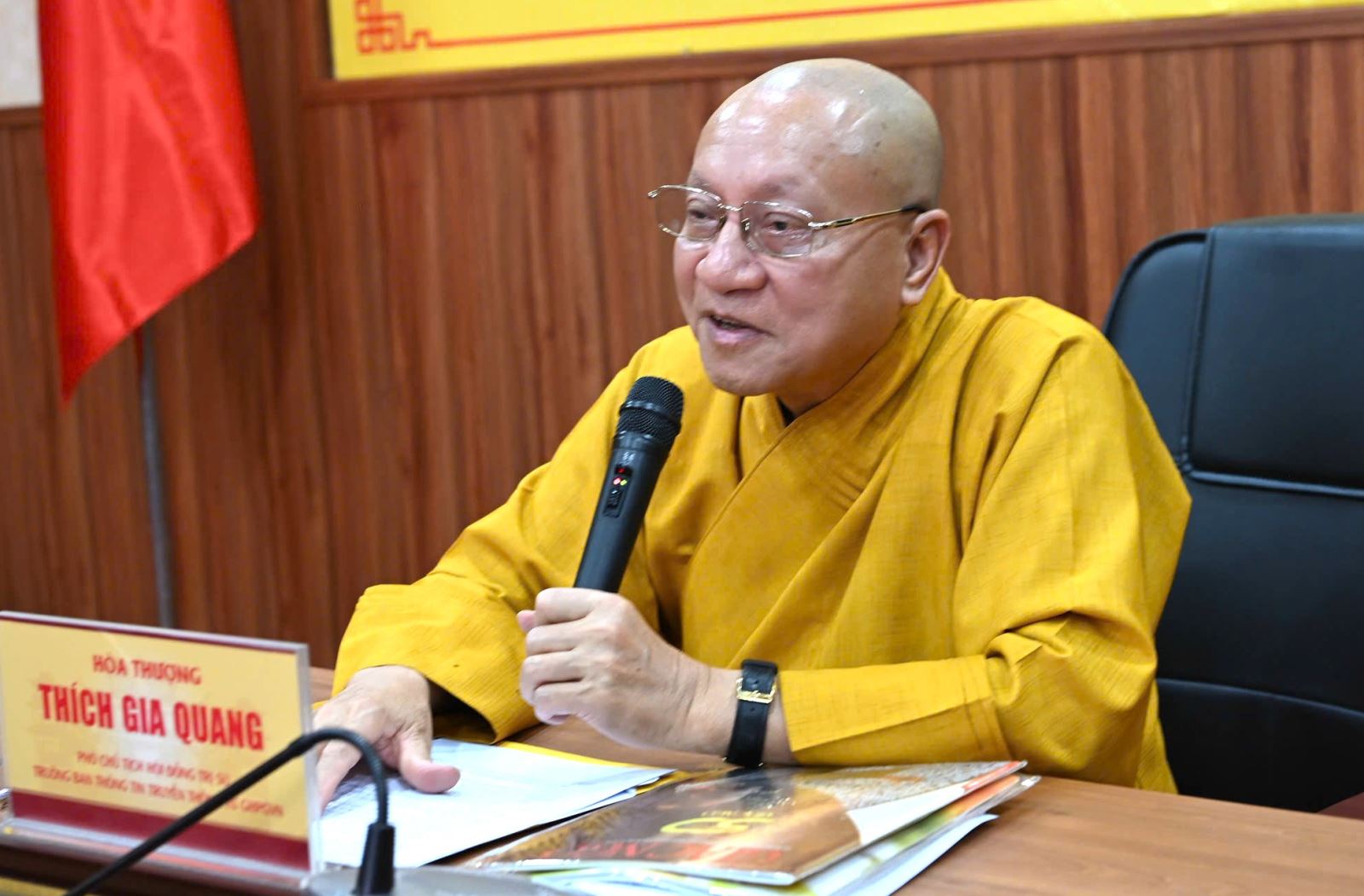 Hòa thượng Thích Gia Quang, Phó Chủ tịch Hội đồng Trị sự Trung ương Giáo hội Phật giáo Việt Nam, Trưởng ban Thông tin - Truyền thông Trung ương GHPG Việt Nam, Viện trưởng Phân viện Nghiên cứu Phật học Việt Nam tại Hà Nội trả lời phỏng vấn phóng viên báo Tin tức và Dân tộc. Ảnh: Minh Trực