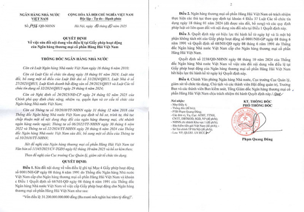 Theo đó, sửa đổi nội dung về vốn điều lệ quy định tại Mục 4 Giấy phép hoạt động số 0001/NH-GP ngày 08/6/1991 do Thống đốc NHNN cấp cho Ngân hàng Thương mại cổ phần Hàng Hải Việt Nam và khoản c Điều 1 Quyết định số 68/NH-QĐ ngày 08/6/1991 của Thống đốc NHNN về việc cấp Giấy phép hoạt động cho Ngân hàng Thương mại cổ phần Hàng Hải Việt Nam như sau: