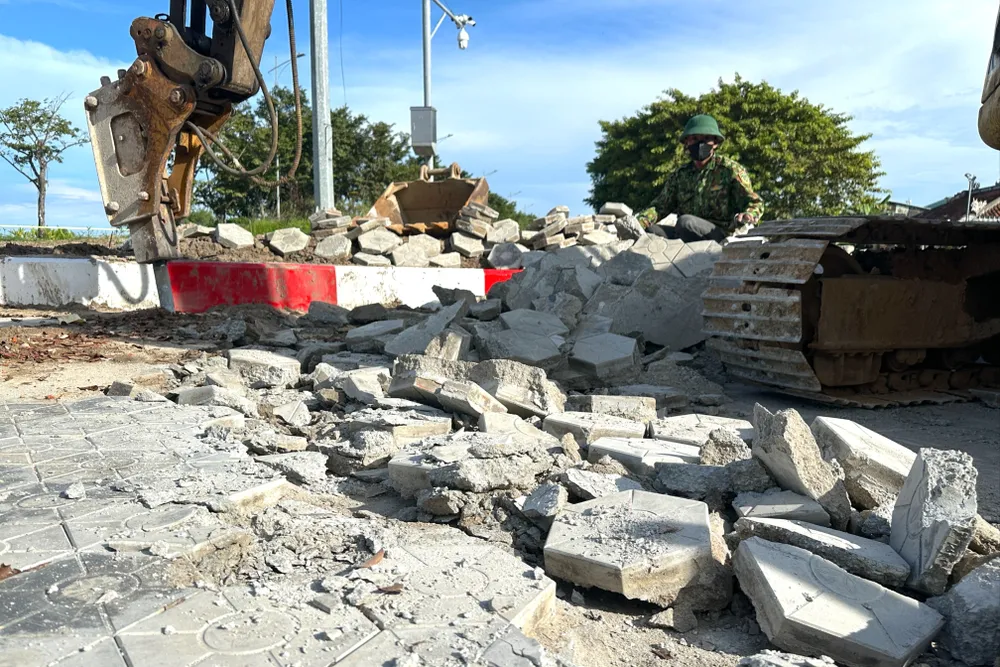 Một máy đục chuyên dụng và hai công nhân đang bóc tách bề mặt tại công trường. Ảnh: TN