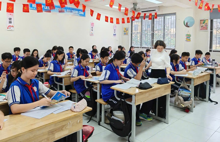 Dự thảo sửa đổi quy định về dạy thêm, học thêm sẽ trao quyền cho hiệu trưởng trong việc quyết định thời lượng dạy thêm. Trong ảnh: Một tiết học của học sinh Trường Trung học cơ sở Thành Công (phường Giảng Võ). Ảnh: Minh Khang