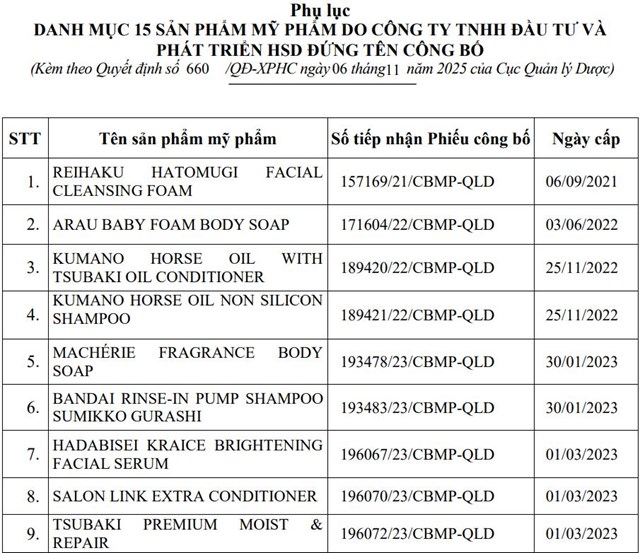 Cục Quản lý Dược xử phạt Công ty TNHH Đầu tư và Phát triển HSD 75 triệu đồng và buộc thu hồi, tiêu hủy 15 sản phẩm mỹ phẩm.