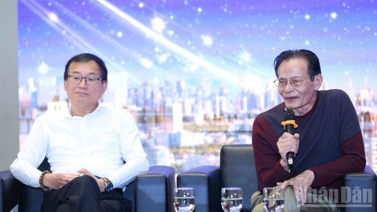 Tiến sĩ Lê Xuân Nghĩa, thành viên Hội đồng Tư vấn chính sách của Thủ tướng Chính phủ, nguyên Phó Chủ tịch Ủy ban giám sát tài chính quốc gia (bên phải ảnh) và Phó Giáo sư, Tiến sĩ Nguyễn Quang Tuyến, Phó Chủ tịch Hội đồng Trường, Trưởng khoa Pháp luật kinh tế Trường Đại học Luật Hà Nội.