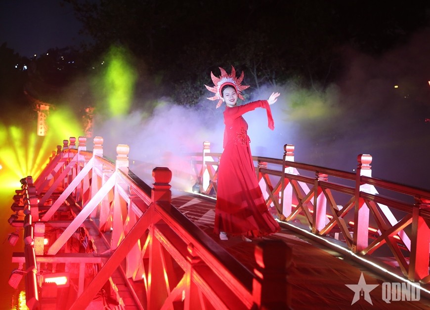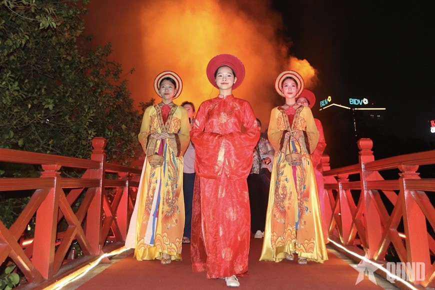 Theo chân các "tiên nữ", khách tham quan tiếp tục hành trình tour đêm với “Nghi thức đón linh khí đất trời” tại cầu Thê Húc và Đắc Nguyệt Lâu.