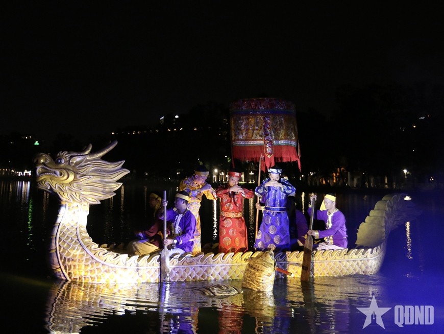 Điểm nhấn đặc biệt gây ấn tượng với khách tham quan là hành trình “xuyên không” về khoảnh khắc Vua Lê trả lại gươm báu cho Rùa vàng tại Đình Trấn Ba. Hình ảnh ấy ghi dấu sâu sắc không chỉ bởi công nghệ ánh sáng hiện đại, mà còn đánh thức trong mỗi người Việt niềm tự hào về lịch sử và tinh thần sử thi dân tộc.