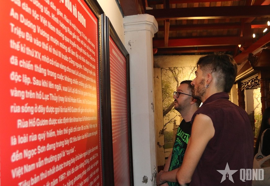 Du khách quốc tế tìm hiểu về đền Ngọc Sơn.