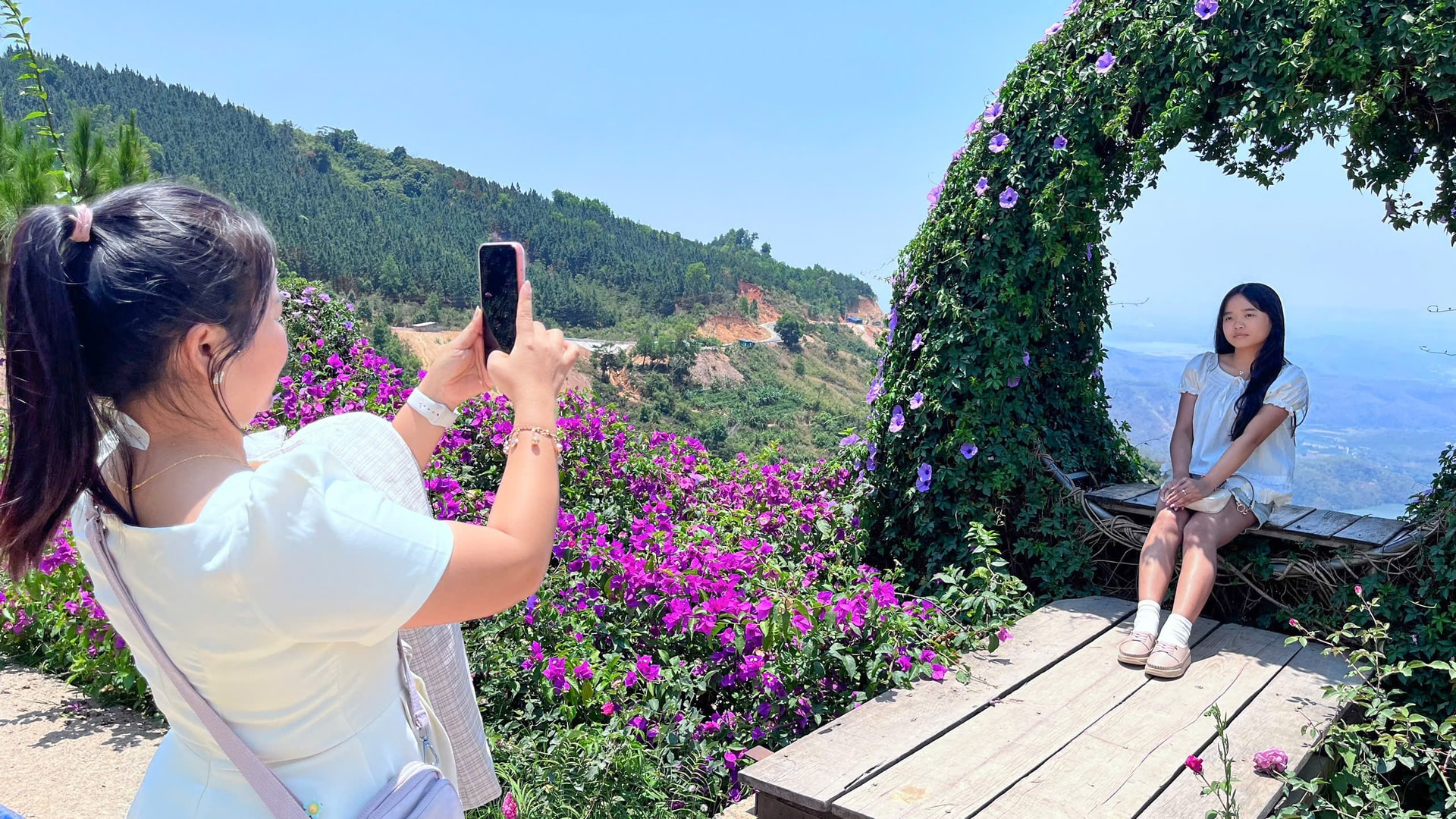 Dừng chân trải nghiệm trên đỉnh đèo Đại Ninh, quốc lộ 28B, gia đình anh Phù Quốc Hiển ở TP. Hồ Chí Minh không quên chọn những góc máy để check-in cảnh đẹp cho nhau, mở đầu chuyến du lịch đến với Đà Lạt.