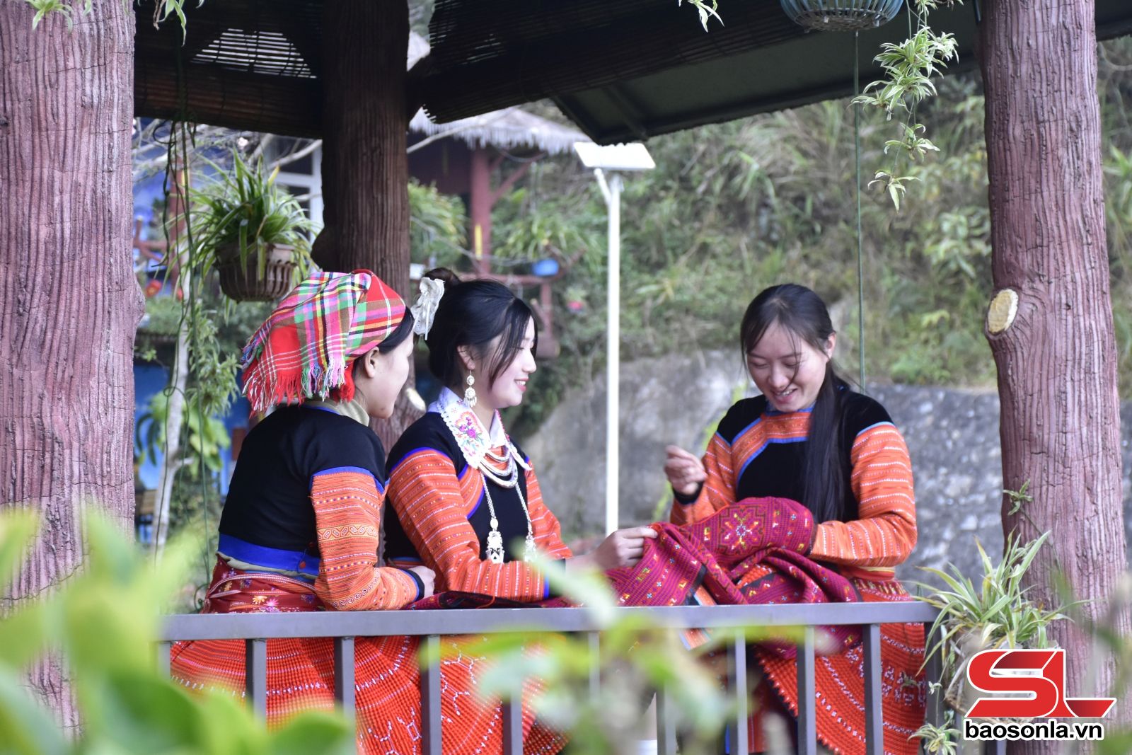 Thiếu nữ dân tộc Mông xã Tà Xùa may áo váy mới.