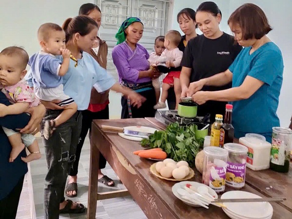 Hướng dẫn thực hành dinh dưỡng cho phụ nữ nuôi con nhỏ tai một xã vùng cao tỉnh Tuyên Quang. Ảnh: Hòa Nguyễn.