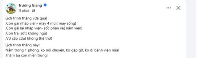 Không chỉ Nhã Phương, tháng 11 vừa qua cũng là khoảng thời gian đầy thử thách với cả gia đình cô khi các thành viên nhí cũng gặp vấn đề sức khỏe. Trường Giang từng chia sẻ về giai đoạn khó khăn này: “Lịch trình tháng vừa qua. Con gái nhập viện – khâu 4 mũi (may sống). Con gái lại nhập viện – sốc phản vệ (nằm viện). Con trai sốt (không ngủ). Vợ cấp cứu (không thể thở)”.