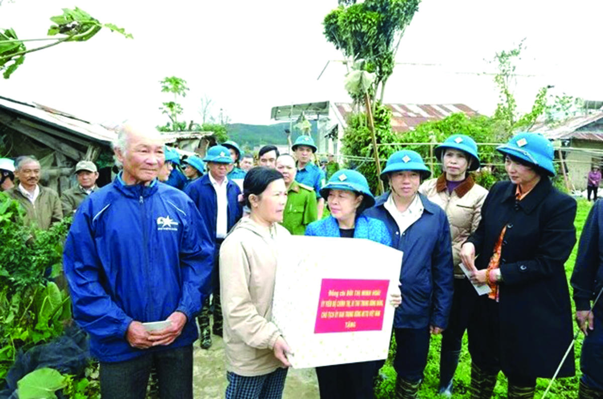 Chủ tịch UBTƯ MTTQ Việt Nam Bùi Thị Minh Hoài trao quà cứu trợ cho đồng bào vùng lũ tại xã Ka Đô, tỉnh Lâm Đồng.
