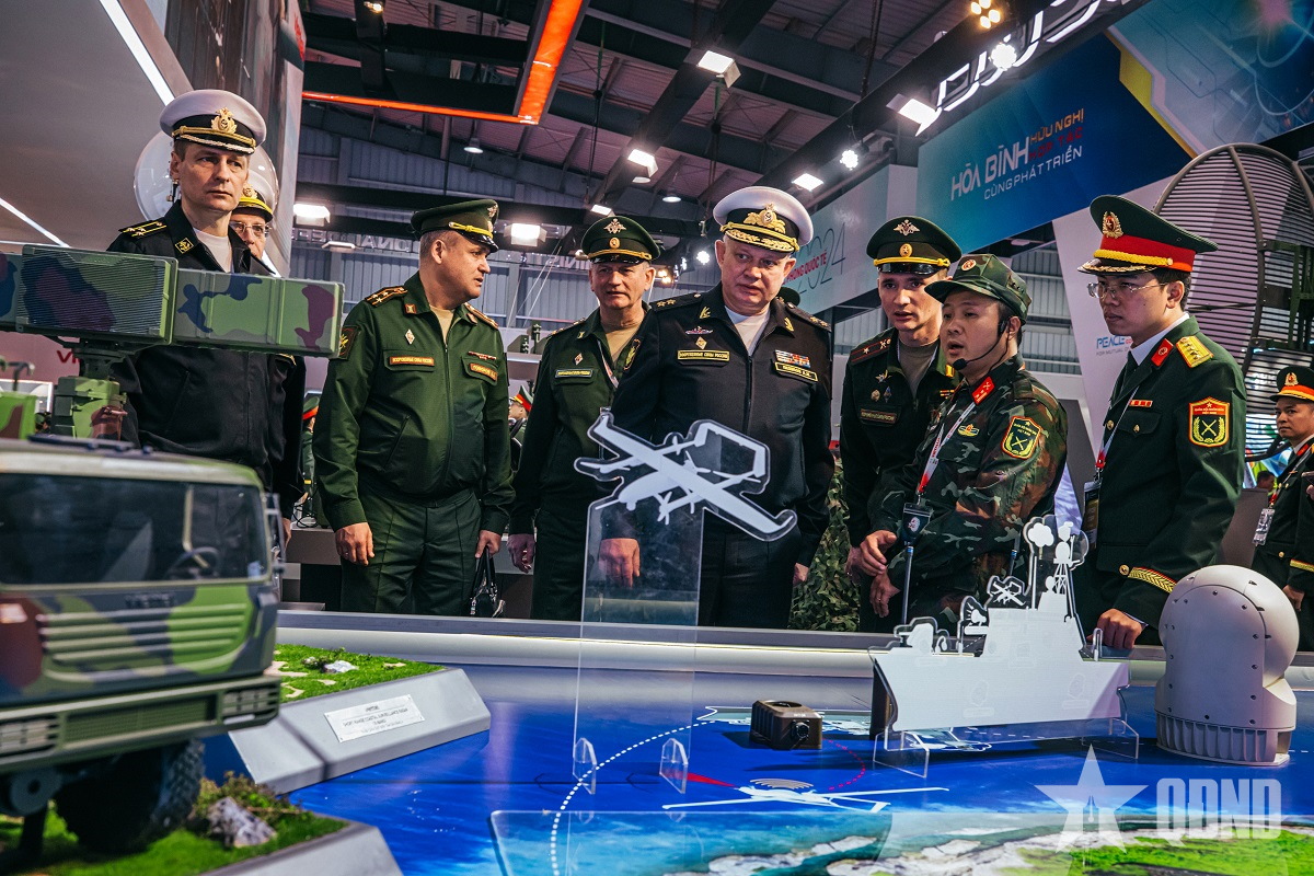 Những vị khách quốc tế tham quan khu trưng bày các sản phẩm công nghiệp quốc phòng Việt Nam tại Triển lãm Quốc phòng quốc tế Việt Nam năm 2024. Ảnh: LIÊN VIỆT