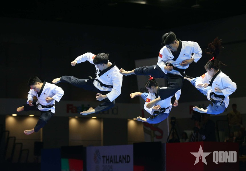 Tình huống bay người trên không của các võ sĩ Việt Nam trong bài thi đoạt huy chương vàng nội dung quyền biểu diễn sáng tạo đồng đội nam nữ, môn taekwondo.