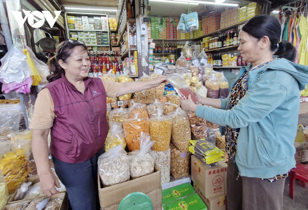 Bà Trần Thị Thu, hộ kinh doanh bánh kẹo tại chợ Cồn, TP Đà Nẵng (bên trái) đã chuẩn bị nhiều mặt hàng bán ra dịp Tết