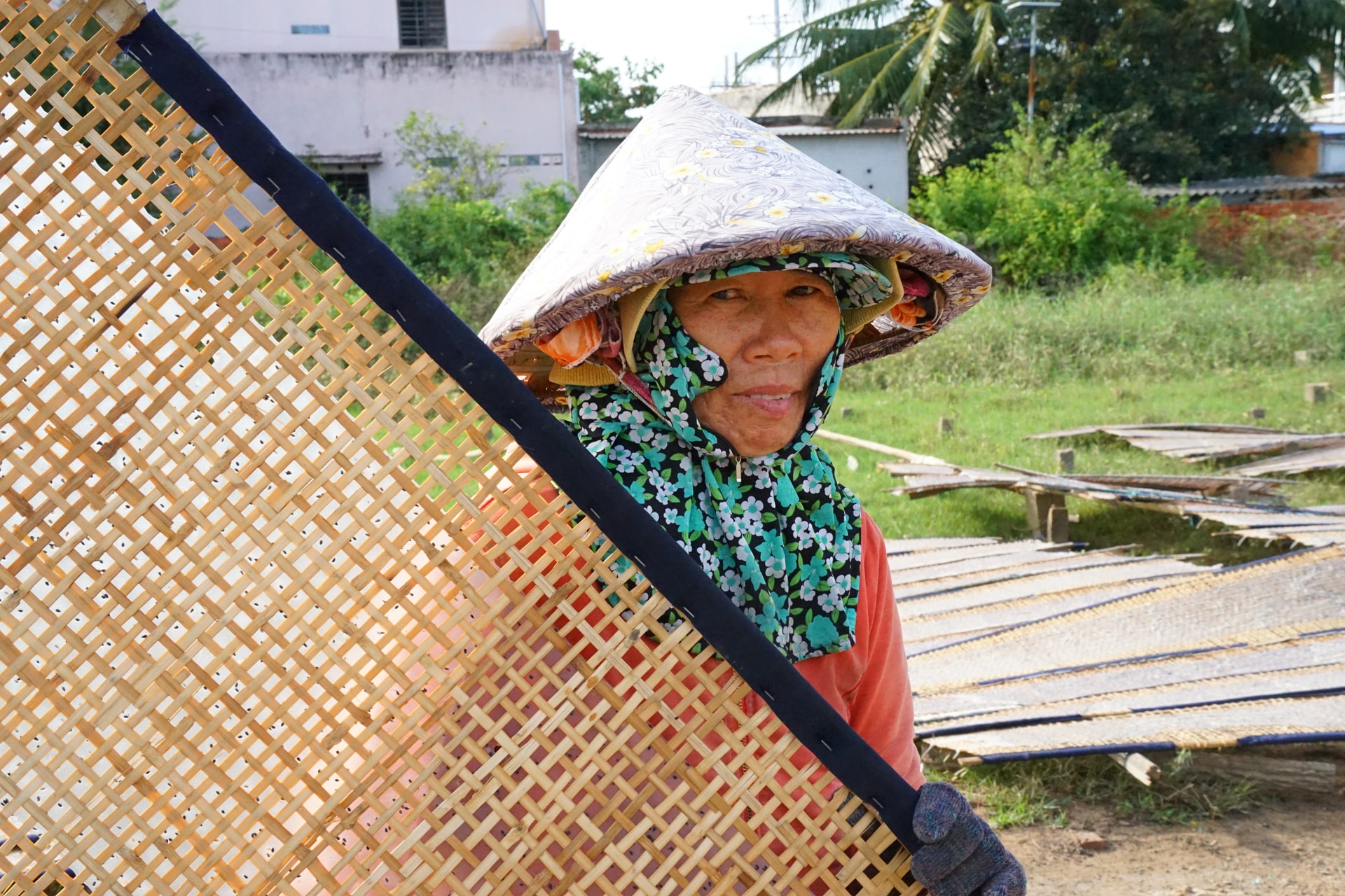 Công nhân xưởng bánh tráng làm việc trên sân phơi