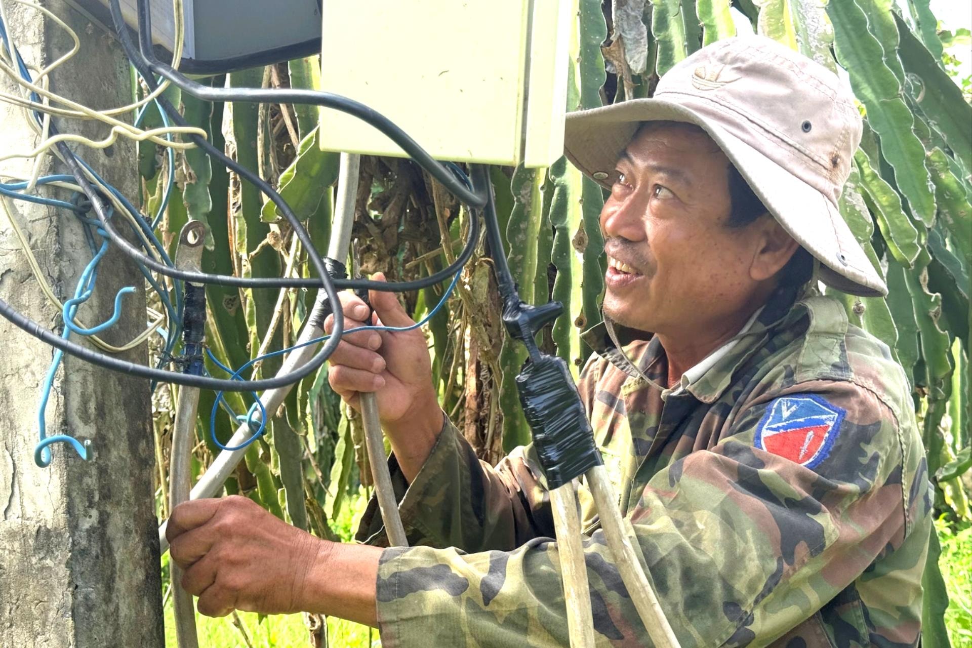 Hiện tại, ông Linh đang tất bật cắt cỏ, vệ sinh lại vườn thanh long và chuẩn bị kéo dây, bóng chong đèn cho 800 trụ có thể hy vọng cho vụ Tết.