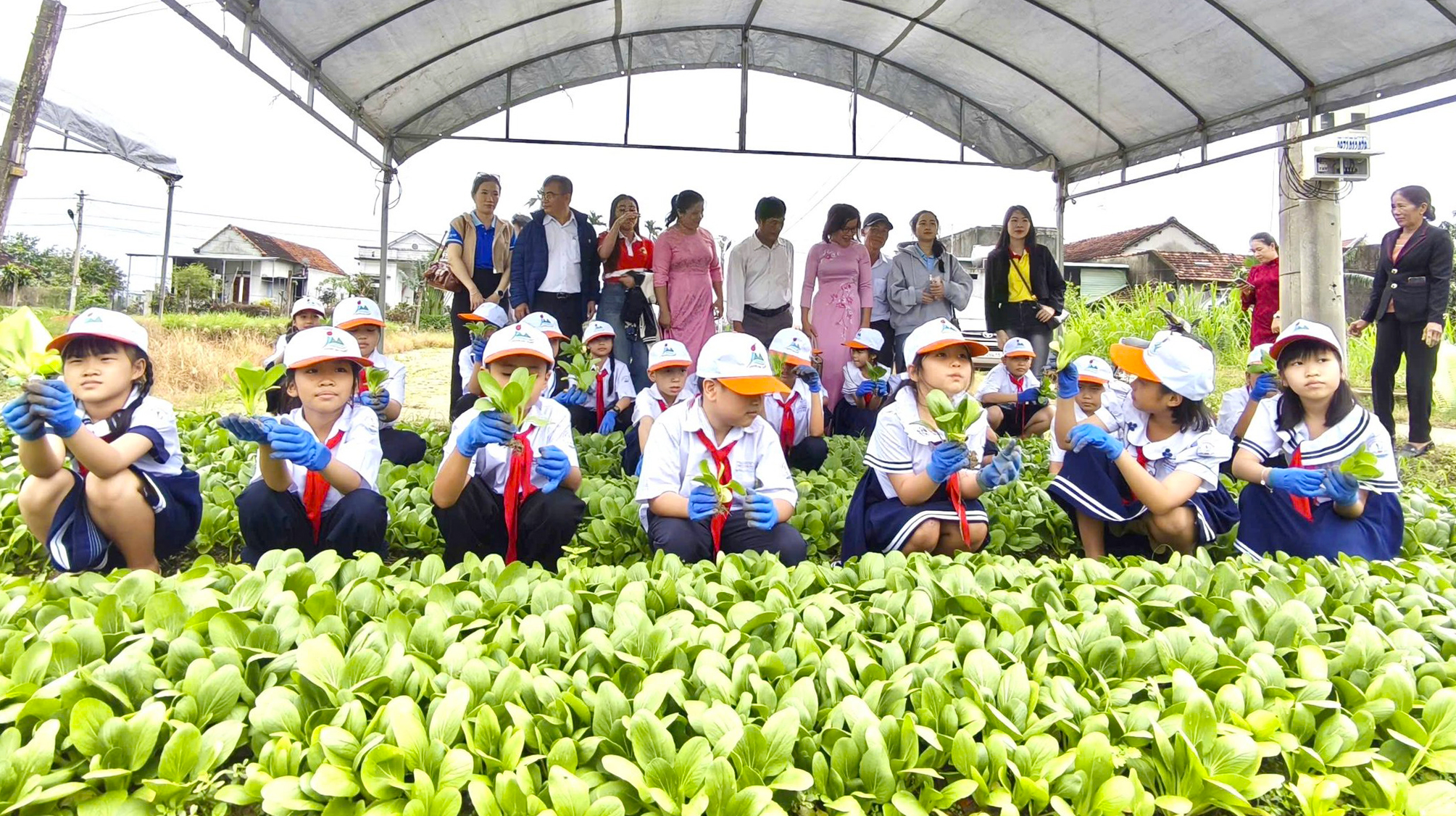 Các em học sinh trải nghiệm trồng rau tại làng Thuận Nghĩa