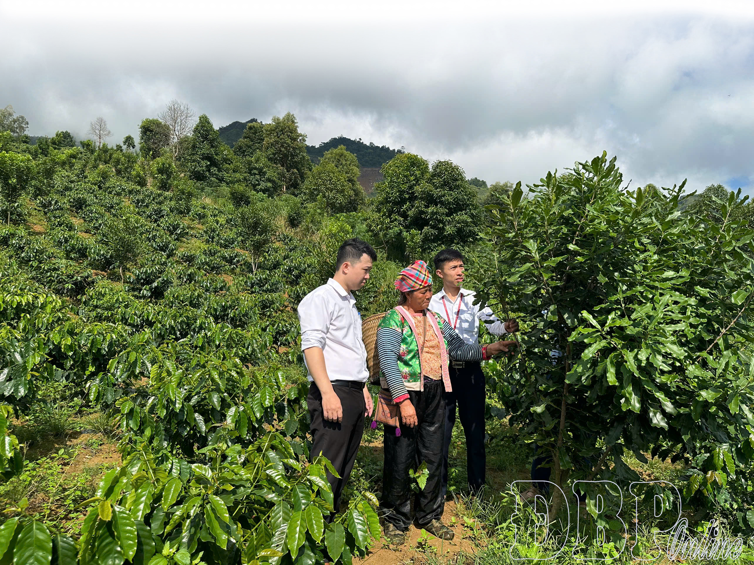 Người dân xã Tuần Giáo chăm sóc vườn cây mắc ca xen canh với cà phê.