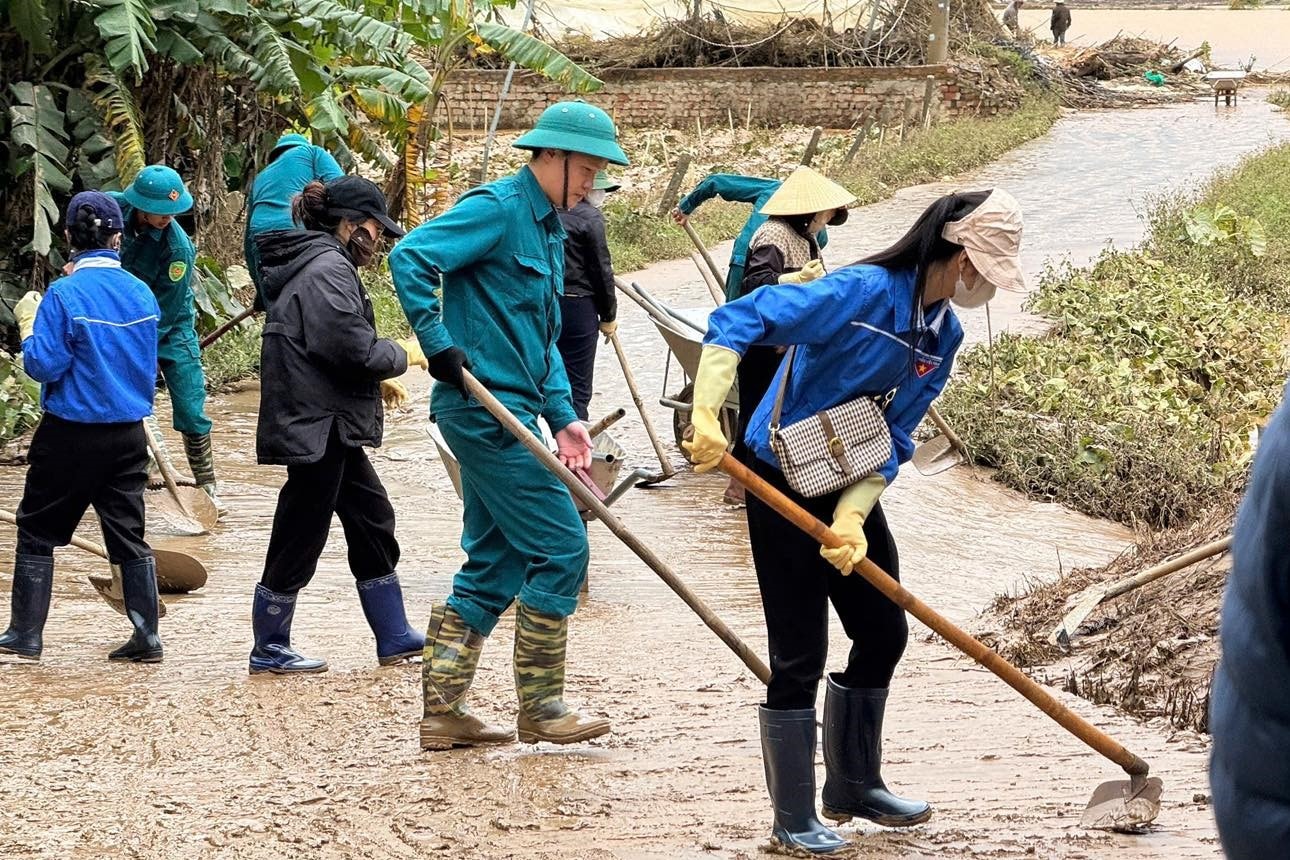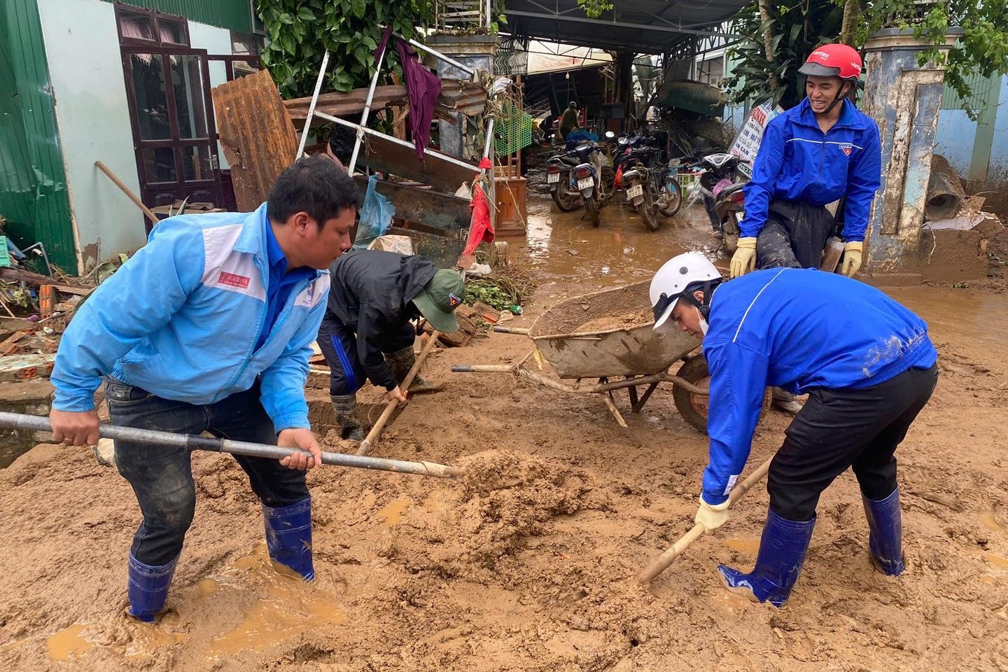 Đoàn viên, thanh niên quét dọn bùn đất sau mưa, lũ