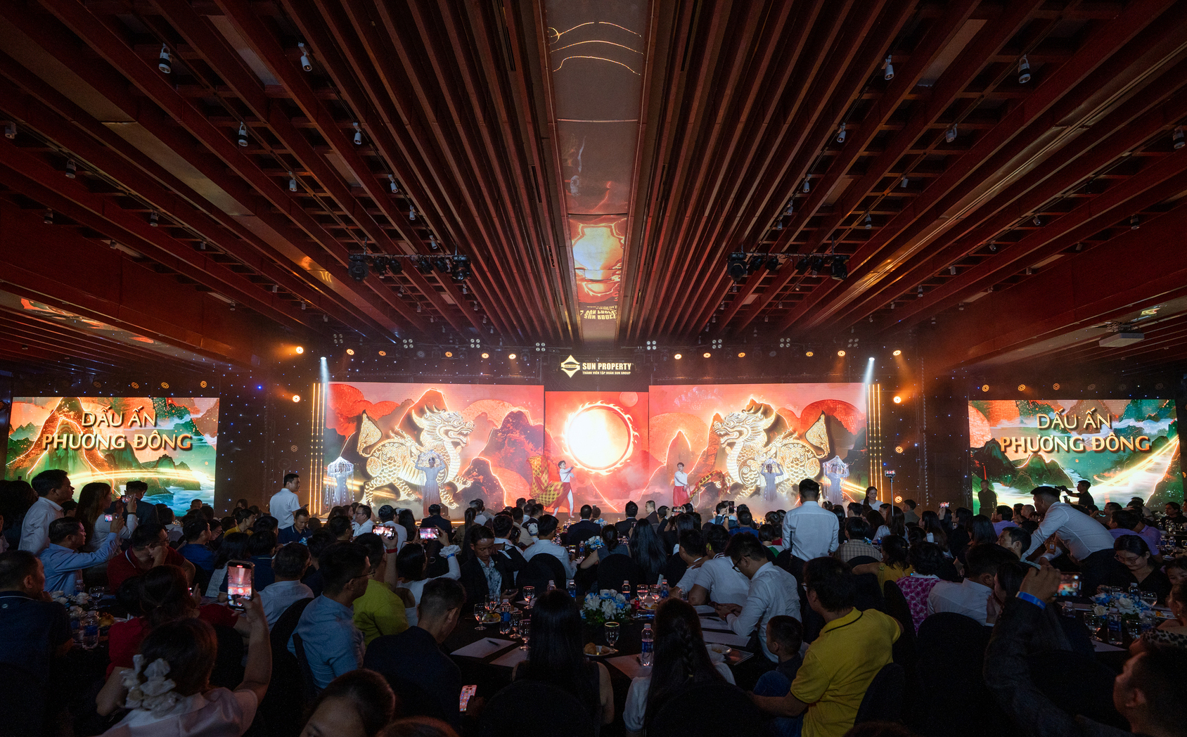Ngay sau đó, khi âm hưởng hào hùng của tiếng trống hội vang khắp hội trường, những vầng sáng Ánh Dương dần lan tỏa, mở ra không gian rực rỡ của màn trình diễn nghệ thuật được dàn dựng công phu. Cao trào chương trình là khoảnh khắc hai tòa tháp Cora Tower vươn cao, kiêu hãnh giữa trời mây Hòa Xuân, xuất hiện trên màn hình lớn.