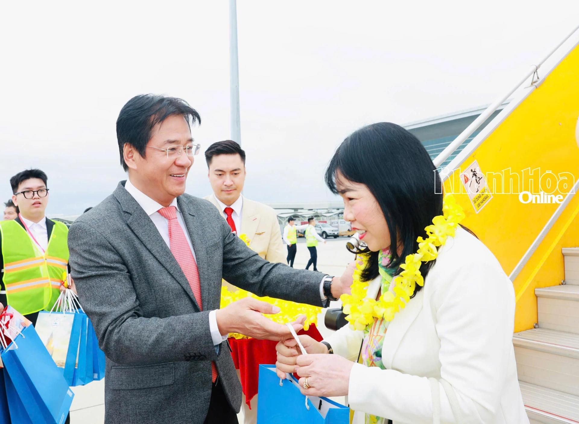 Phó Chủ tịch Thường trực UBND tỉnh Nguyễn Long Biên cùng các đại biểu dự lễ đón chuyến bay đầu tiên của Sun PhuQuoc Airways đến Khánh Hòa.