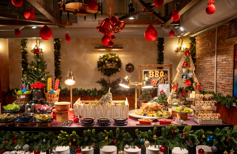 Đại tiệc buffet Giáng sinh chuẩn Âu được bày trí ấm cúng, hấp dẫn thực khách.